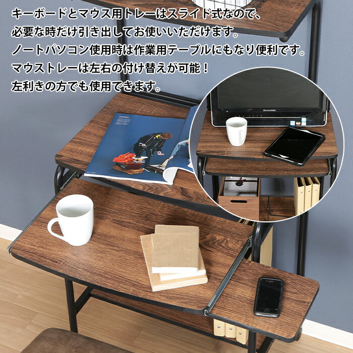 ----------------- 商品詳細 ----------------- サイズ(約):幅600×奥行480×高さ1220mm 材質: [甲板の表面材]合成樹脂化粧パーティクルボード(塩化ビニル樹脂) [構造部材]金属(鋼)エポキシ樹脂塗装 重量(約):15.7kg 耐荷重:(約) [天板]5kg [上部棚板]15kg [下部棚板]3kg [キーボードトレー]3kg [マウストレー]0.5kg 組立て:お客様組立て ----------------- [商品の説明] お部屋を圧迫しないコンパクトサイズのパソコンデスク。 リビングの片隅や書斎の狭いスペースにも設置できます。 キーボードトレーの下にはマウステーブルもついています。 上部の棚板は幅60×奥行30cm、下部の棚板は幅55×奥行30cmでプリンターや書類を収納できます。----------------- 商品詳細 ----------------- サイズ(約):幅600×奥行480×高さ1220mm 材質: [甲板の表面材]合成樹脂化粧パーティクルボード(塩化ビニル樹脂) [構造部材]金属(鋼)エポキシ樹脂塗装 重量(約):15.7kg 耐荷重:(約) [天板]5kg [上部棚板]15kg [下部棚板]3kg [キーボードトレー]3kg [マウストレー]0.5kg 組立て:お客様組立て ----------------- [商品の説明] お部屋を圧迫しないコンパクトサイズのパソコンデスク。 リビングの片隅や書斎の狭いスペースにも設置できます。 キーボードトレーの下にはマウステーブルもついています。 上部の棚板は幅60×奥行30cm、下部の棚板は幅55×奥行30cmでプリンターや書類を収納できます。