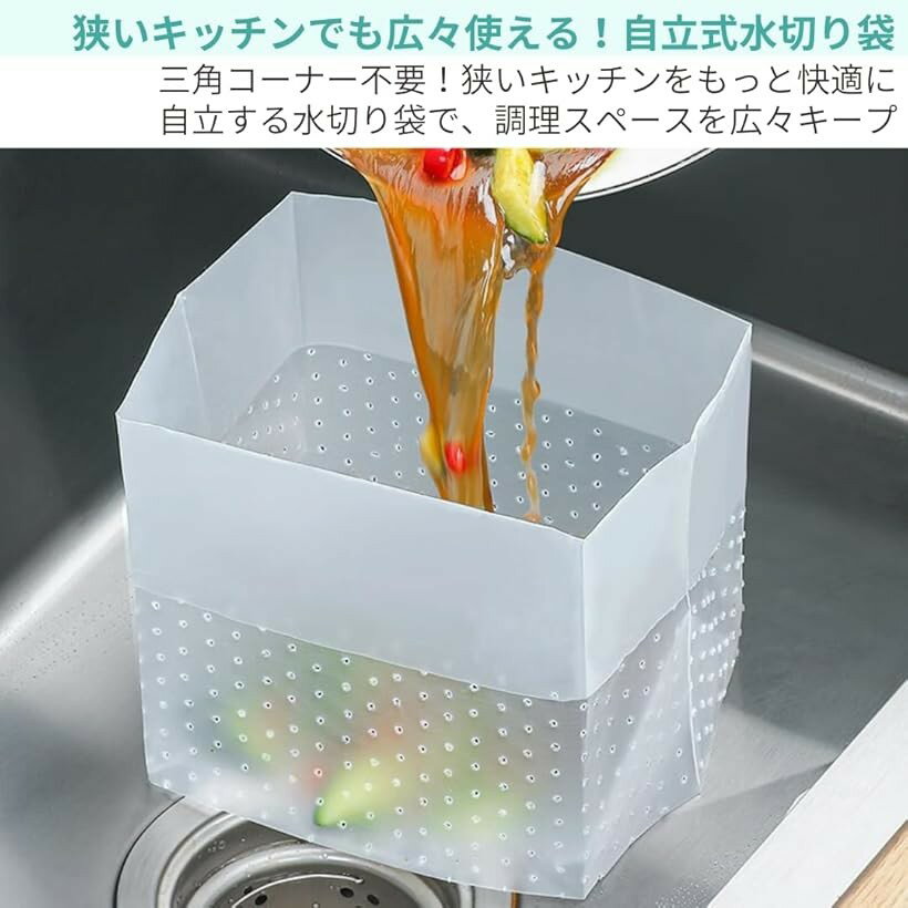 「自立する水切り袋で、狭いキッチンでも広々」三角コーナーのスペースがもったいない…と感じていませんか?この自立する水切り袋なら、その悩みを解決。シンク横に置いても邪魔にならず、調理スペースを確保。生ゴミも手軽に処理でき、使い捨てで衛生的。毎日のクッキングをもっと快適に。底面が広いため安定感抜群で、倒れる心配もありません。使いたい時にサッと広げて使える手軽さも魅力。「メッシュ構造で水切れ抜群」メッシュ水切り袋で、生ゴミ処理が楽々。細かいゴミや水分もしっかりキャッチし、シンクを汚しません。通気性が良いので、生ゴミ特有の嫌な臭いも軽減。広口設計でゴミが入れやすく、カップ麺の汁捨てにも最適。丈夫なポリプロピレン素材で破れにくく、安心して使えます。「使い捨てで清潔さをキープ」100枚セットの大容量。毎日気軽に使える使い捨て水切り袋は、日常の家事をスムーズにします。生ゴミ捨てはもちろん、野菜や果物の水切りにも便利。三角コーナーのように洗う手間もなく、使い捨てだから、常に清潔。キッチンだけでなく、化粧台や洗面所でも活躍。使用済みコットンや綿棒などを、その場で捨てられます。買い置きの手間も省けて、忙しい方にぴったりです。「商品詳細」セット枚数:100枚 サイズ:25 x 18 x 12(cm) 材質:PP素材 *ゴミを入れる前にフチを1~2回外側に折り返すと、しっかりと自立し、より使いやすくなります。※ 他ネットショップでも併売しているため、ご注文後に在庫切れとなる場合があります。予めご了承ください。※ 品薄または希少等の理由により、参考価格よりも高い価格で販売されている場合があります。ご注文の際には必ず販売価格をご確認ください。※ 沖縄県、離島または一部地域の場合、別途送料の負担をお願いする場合があります。予めご了承ください。※ お使いのモニタにより写真の色が実際の商品の色と異なる場合や、イメージに差異が生じることがあります。予めご了承ください。※ 商品の詳細(カラー・数量・サイズ 等)については、ページ内の商品説明をご確認のうえ、ご注文ください。※ モバイル版・スマホ版ページでは、お使いの端末によっては一部の情報が表示されないことがあります。すべての記載情報をご確認するには、PC版ページをご覧ください。「自立する水切り袋で、狭いキッチンでも広々」三角コーナーのスペースがもったいない…と感じていませんか?この自立する水切り袋なら、その悩みを解決。シンク横に置いても邪魔にならず、調理スペースを確保。生ゴミも手軽に処理でき、使い捨てで衛生的。毎日のクッキングをもっと快適に。底面が広いため安定感抜群で、倒れる心配もありません。使いたい時にサッと広げて使える手軽さも魅力。