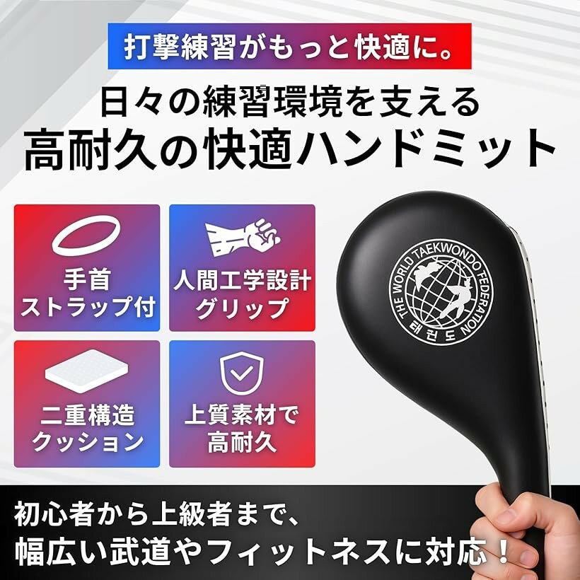 「健康促進にも最適」ダイエットや運動不足解消、ストレス発散など、健康維持のための運動にもぴったりのアイテムです。「軽快な打撃音」ミット部分が二層構造になっており、クリーンヒットした際に心地よい打撃音が鳴ります。打撃の練習がさらに楽しくなります。「落下防止機能」強力な手首スラップが付属しており、キックパッドの落下を防ぎます。受け手の方も安心して練習に集中できます。「多様な武道に対応」空手、テコンドー、キックボクシング、ムエタイの練習に最適なミットで、ビギナーから上級者までご利用いただけます。※ 他ネットショップでも併売しているため、ご注文後に在庫切れとなる場合があります。予めご了承ください。※ 品薄または希少等の理由により、参考価格よりも高い価格で販売されている場合があります。ご注文の際には必ず販売価格をご確認ください。※ 沖縄県、離島または一部地域の場合、別途送料の負担をお願いする場合があります。予めご了承ください。※ お使いのモニタにより写真の色が実際の商品の色と異なる場合や、イメージに差異が生じることがあります。予めご了承ください。※ 商品の詳細(カラー・数量・サイズ 等)については、ページ内の商品説明をご確認のうえ、ご注文ください。※ モバイル版・スマホ版ページでは、お使いの端末によっては一部の情報が表示されないことがあります。すべての記載情報をご確認するには、PC版ページをご覧ください。