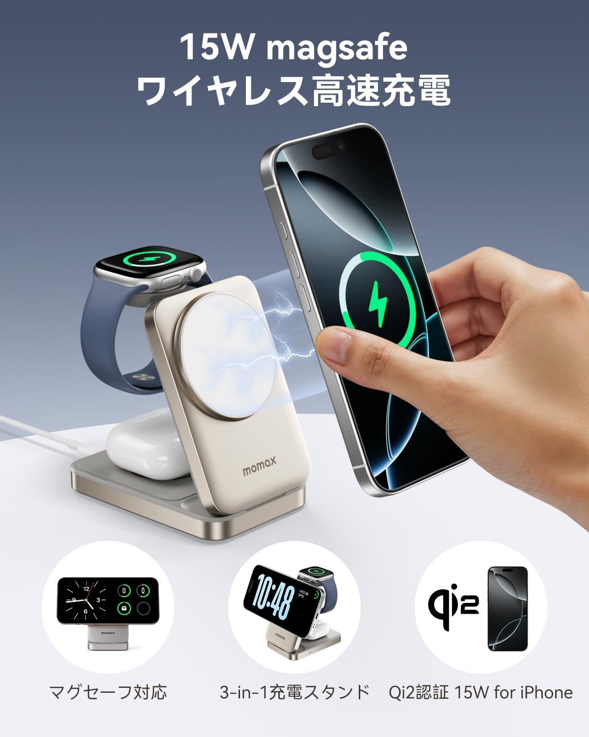 MOMAX Qi2 ワイヤレス充電器 (3-in-1) magSafe公式認証 マグセーフ 15W急速充電 3台同時充電可能 折り畳み式 角度調整可能 合金質感 ワイヤレス充電ステーション iPhone16/15/14/13/12/iWatch/AirPods/ワイヤレスイヤホンに対応 MFI認証済み