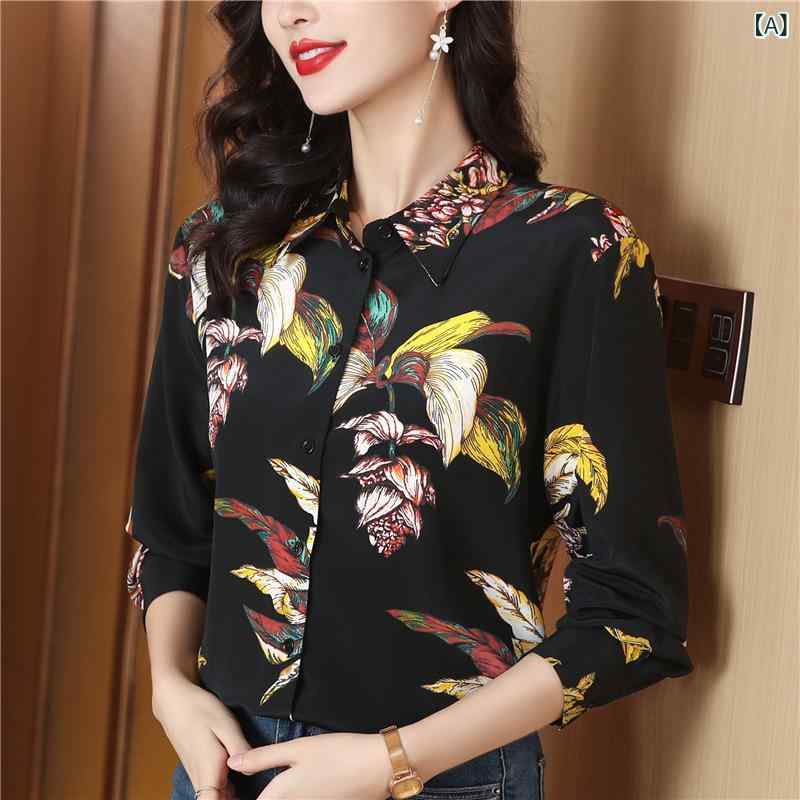 シャツ レディース 上品 きれいめ シルク調 花柄プリント 長袖 ポロ襟 前開き ブラウス 春夏 トップス 通勤 オフィス カジュアル ストレートシルエット 光沢感