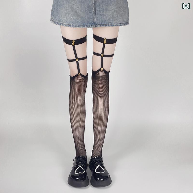 網タイツ レディース 通気性 薄手 スタイルアップ ダークセクシー ニーハイ丈 メタルバックル 編み上げ ストラップ フィッシュネット シースルー 黒 JK風 原宿系 コスプレ イベント