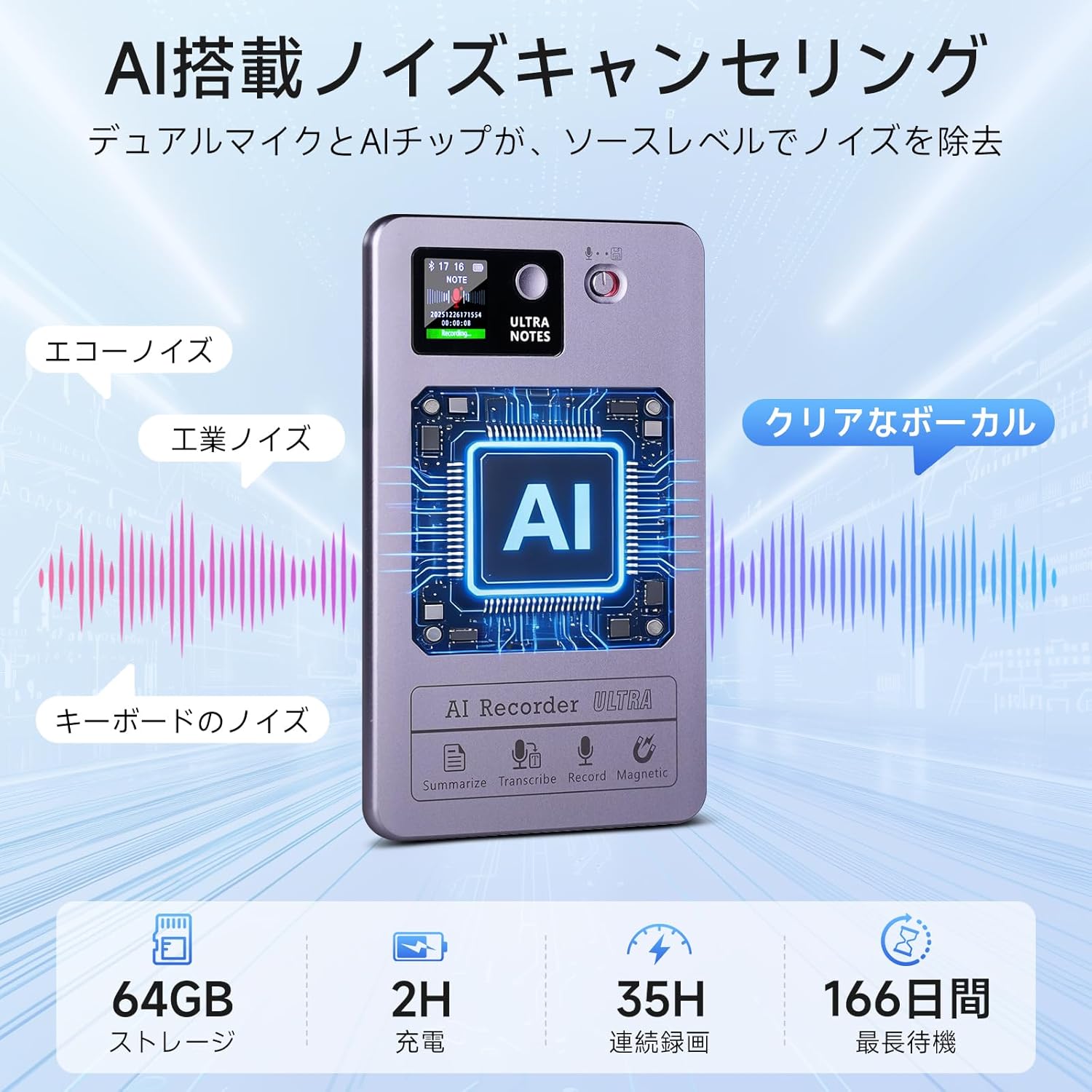 【新品限定価格!!】AI ボイスレコーダー 小型 文字起こし GPT-5搭載 ワンタッチ録音 aiレコーダー 64GB大容量 152言語対応 35時間連続使用 超薄0.5cm AI人声強化 議事録自動作成 マインドマップ 通常録音/通話録音モード iphone&Android対応 会議/授業/インタービュー