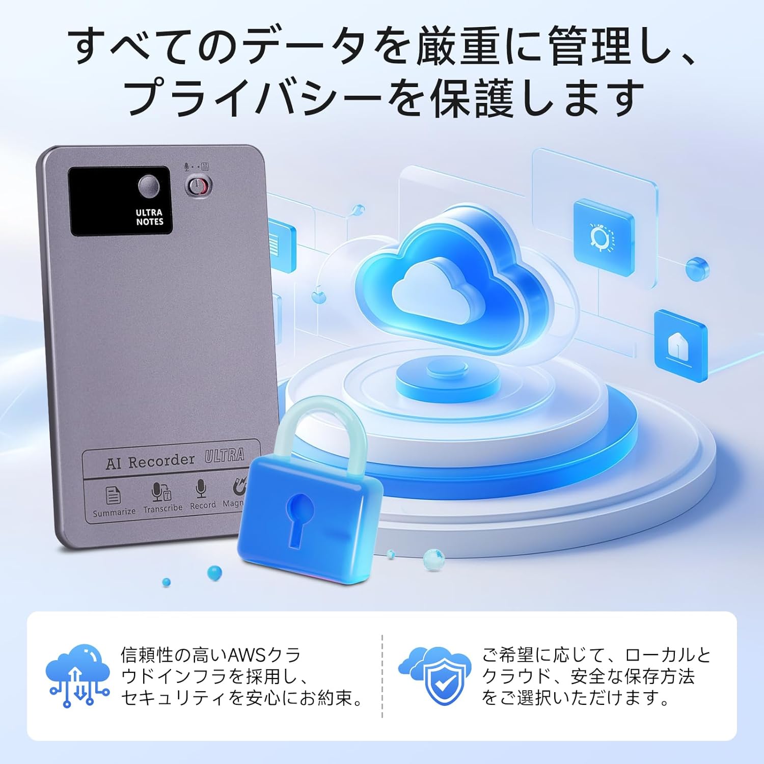 【安全性の高い専用アプリ】小型ボイスレコーダーは、オンライン・オフライン両対応で、どこでも確実に録音可能。全ての音声データは端末とクラウドで暗号化され、許可なく第三者へ共有されることはありません。AWSで保護されたプライベートストレージにより、録音ファイルはユーザー本人のみがアクセス可能。iOS/Android対応「Doway」アプリから手軽に管理できます。