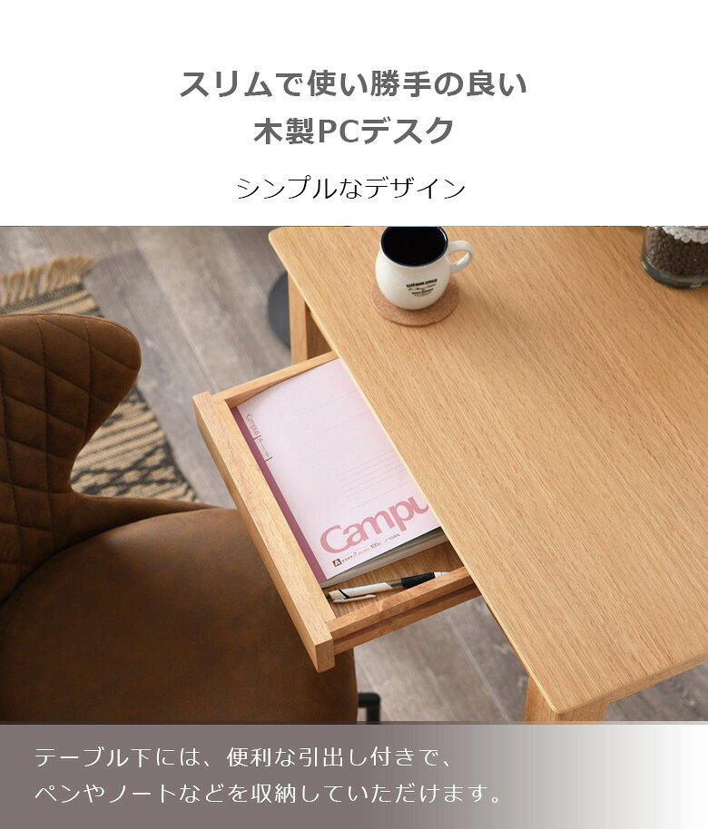 ■商品の特徴 スリムでシンプルなデザインの使い勝手の良い木製PCデスク。 テーブル下には、便利な引出し付きでノートやペンなどを収納いただけます。
