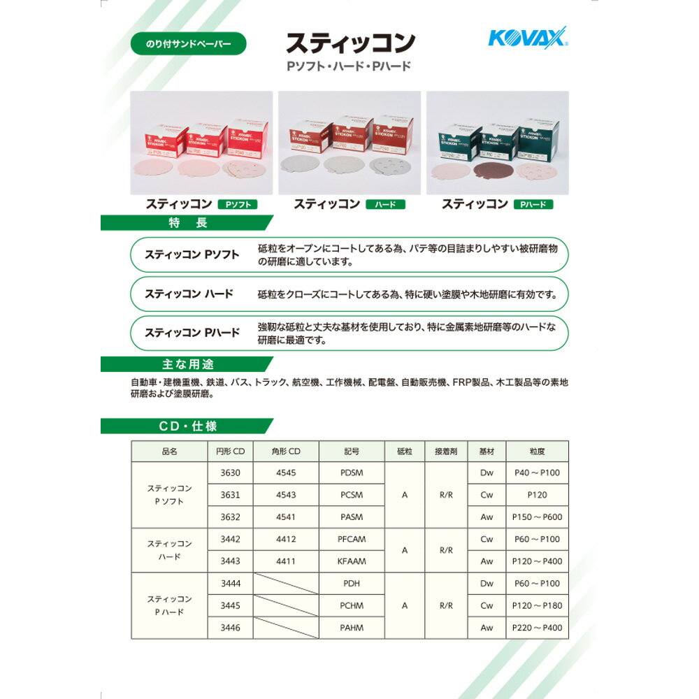 【用途】・自動車補修塗装研磨・FRPやプラスチック製品の素地研磨・塗装面研磨・金属塗装における下地研磨から硬質塗膜研磨・建機や工作機械などにおけるパテ研磨と中研ぎ