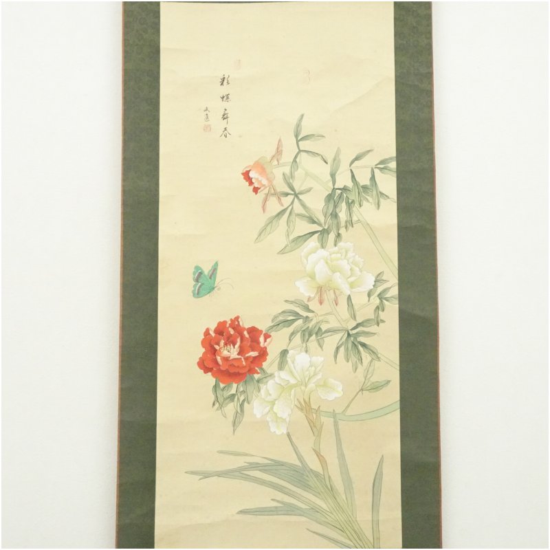 【中古】【書画】文進筆 彩蝶寿春 花蝶図 肉筆紙本掛軸掛け軸 床の間 書 おしゃれ 絵画 表具 芸術 茶道 年中掛け インテリア 茶掛 掛物 和室 1月 冬