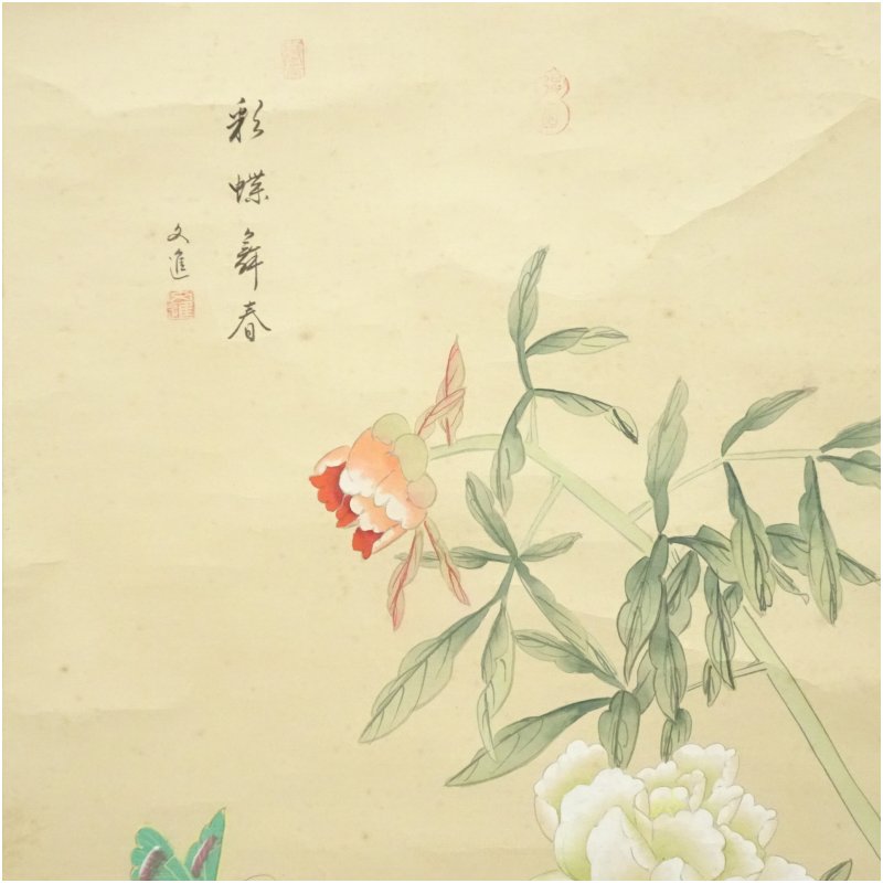 【茶道具・着物】送料無料文進筆 彩蝶寿春 花蝶図 肉筆紙本掛軸