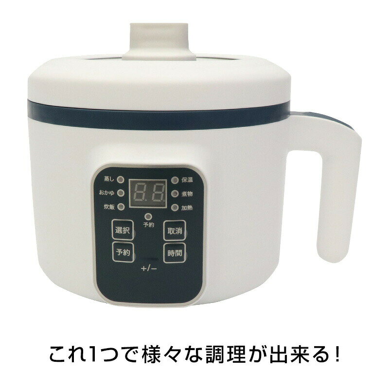 ■商品詳細鍋料理も蒸し料理もごはんも炊けるモードは6タイプ・蒸し・おかゆ・炊飯・保温・煮物・加熱透明のガラス蓋なので料理の状態が確認出来ます。容量は1.5L!一人で使っても2人でシェアして満足感たっぷり!鍋の深さは約8.5cm。深さがあるのでお鍋やラーメン、カレーなどの鍋料理にもぴったりです。蒸し器を使うと下の段と上の段で同時調理も可能に!持ち運びしやすい把手付き。調理が終わればそのままテーブルへと運んで器としても使えます。保温機能付きだから最後まで温かい料理を美味しく食べられます。お手入れもフッ素コーティングが施されているので調理後のお片付けも簡単です。予約設定は30分〜9時間30分の30分単位で設定出来ます。容量:約1.5L本体サイズ:約210×230×225mm本体重量:約675g素材:ABS樹脂、ステンレス、フッ素コーティング加工定格入力:AC100V 50/60Hz消費電力:260W容量:約1.5L温度ヒューズ:約240℃保温タイマー:約480分セット内容:本体、蒸し器、フタ生産地:中国