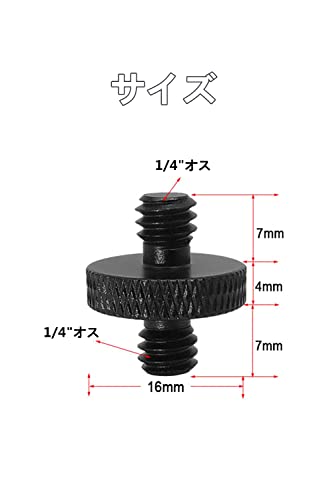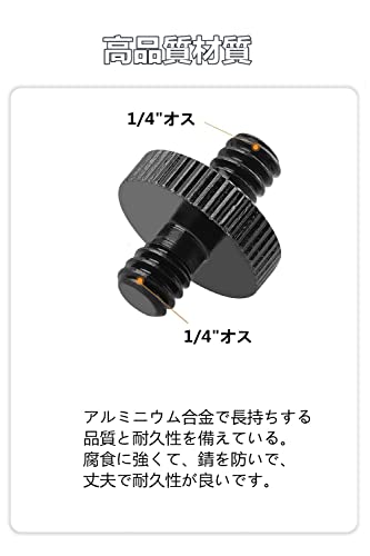 ・黒 1/4オス1/4オス ・・:黒 1/4オス1/4オス・セット内容1/4オス1/4オススレッドネジ*4個。幅広い機材に対応します。・高品質精度の高い仕上げなので、細部まで使いやすさを追求しつつ、機材の組み替えに大活躍です。・材質アルミニウム合金で長持ちする品質と耐久性を備えている。腐食に強くて、錆を防いで、耐久性と安定性は高くて。非常に軽量で丈夫です。・取り付けも簡単サイズが小さくて持ち運びやすくて。美しいデザインと強度を保ちながら。取り付け取り外しはやすいので、頻繁に機材の組み替えがする方にお勧めです。・適用範囲組み合わせて使用でき、1/4メスと1/4メスの繋がりを実現しました。三脚、一脚、一眼レフ、自撮り棒、カメラフラッシュライト、クイックリリースプレート、アンブレラホルダー、ライトスタンド、雲台など多種の撮影アクセサリーに適用しま説明 セット内容1/4オス1/4オススレッドネジ*4個。幅広い機材に対応します。