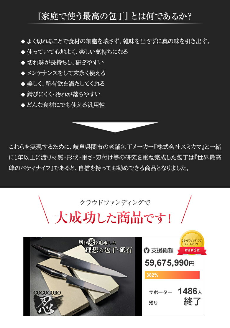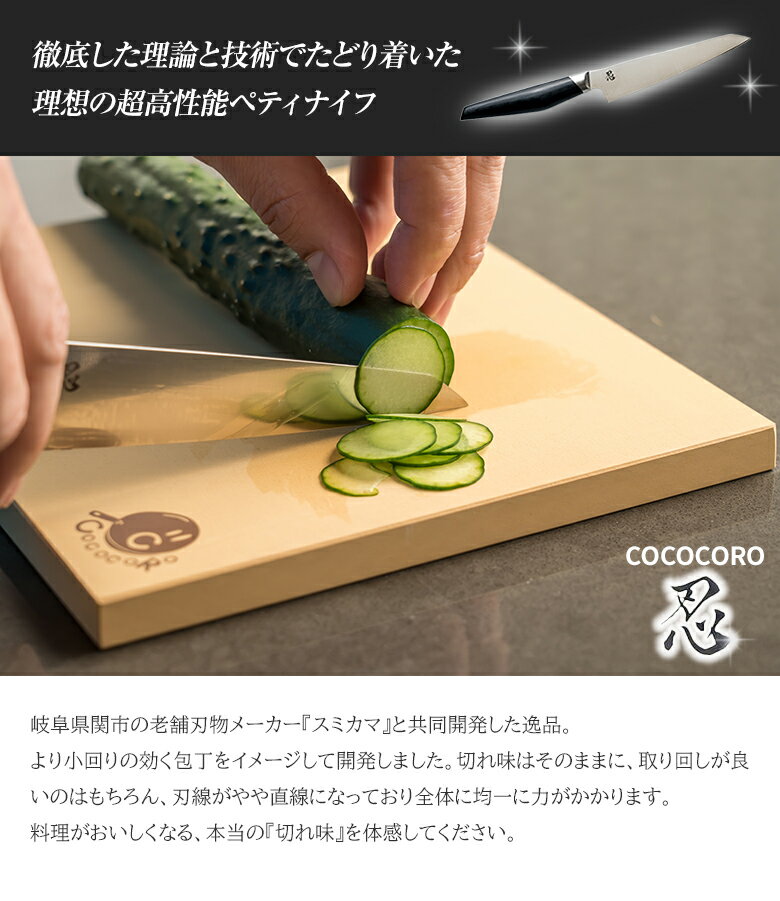 COCOCORO ペティ 忍 コココロ ペティナイフ 高級 VG-10全鋼包丁 V金10号 家庭用 プロ用 万能ペティ おしゃれ スミカマの包丁 日本製 職人 福井 岐阜県関市 刃物産地 刃物工業 刀鍛冶 老舗包丁メーカー 株式会社スミカマ 料理研究家 大西哲也 0024クッキングスタジオ