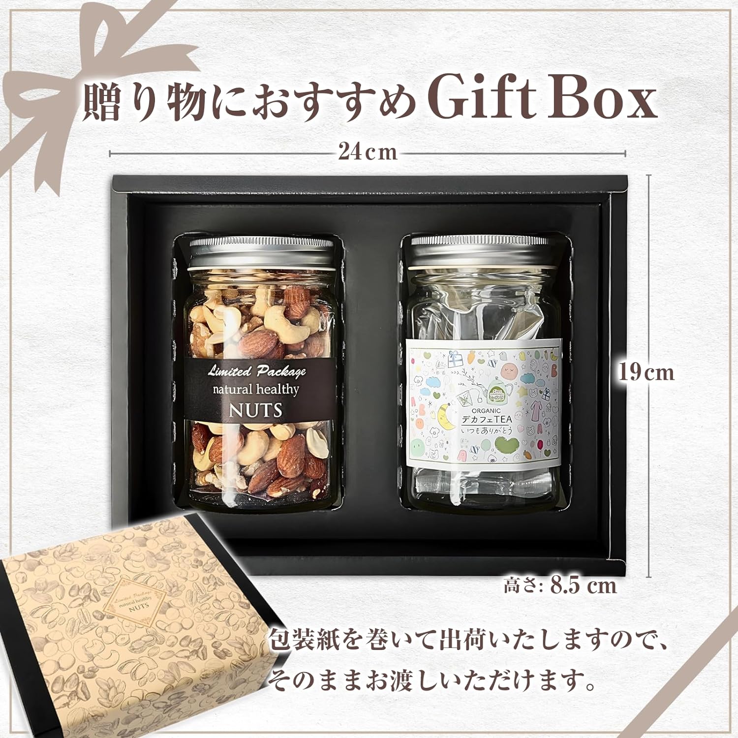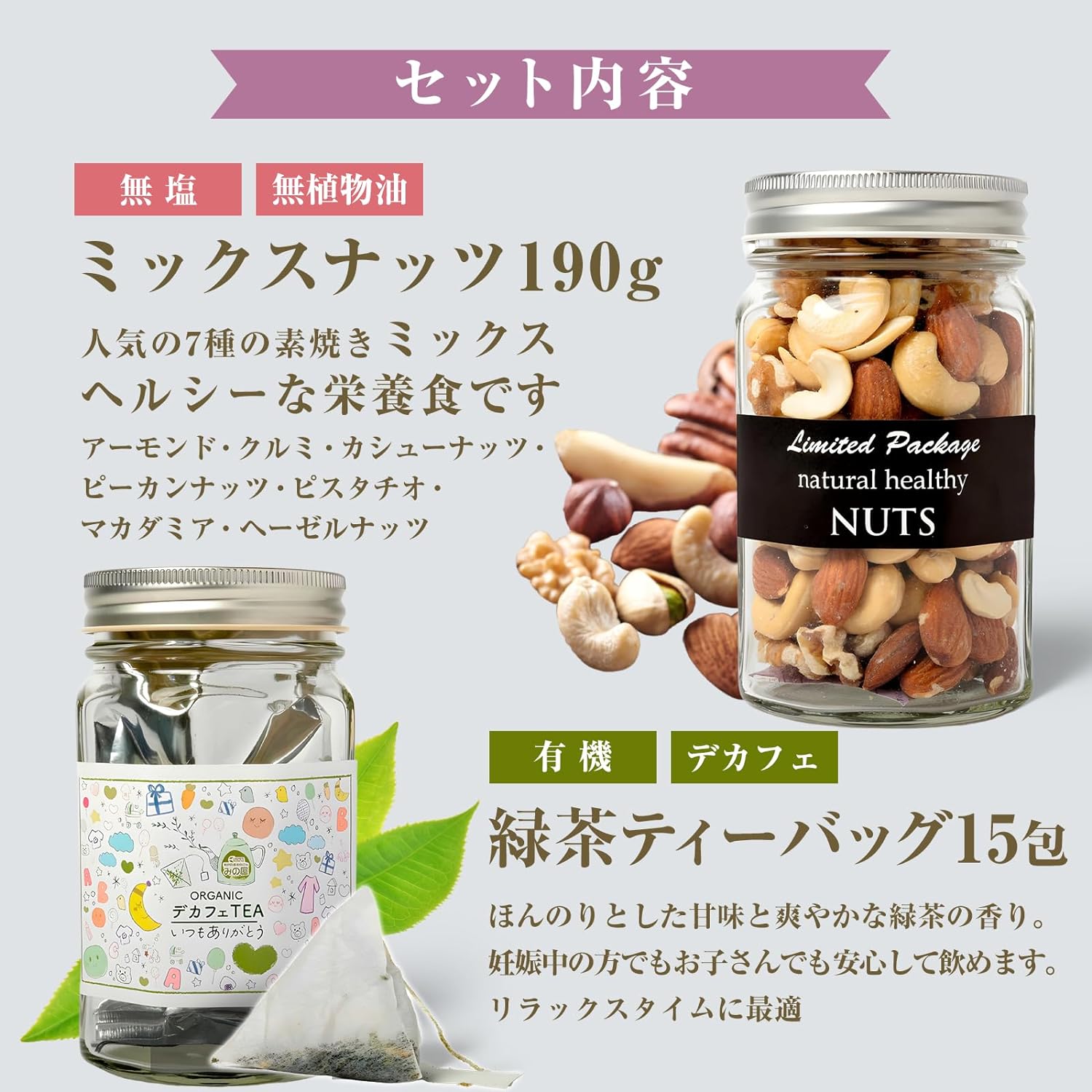 みの屋 有機 デカフェ茶 30g (2g15包)× 7種の素焼きミックスナッツ(190g)中瓶2本セット ミックスナッツ ギフト 母の日 ギフトパッケージ 無農薬 お茶 煎茶 オーガニック 静岡 お土産 高級茶 JAS認定 母の日ギフト 母の日のプレゼント