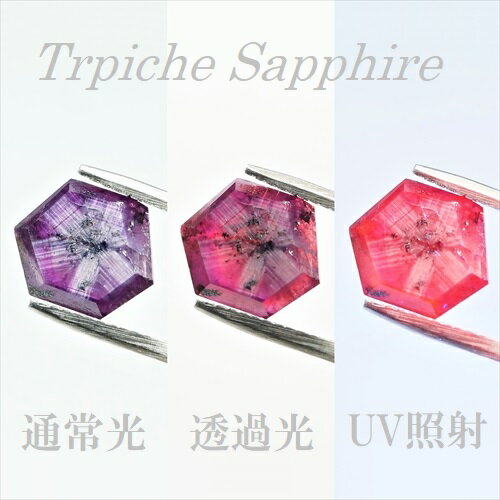 【コメント】 パキスタンの首都イスラマバードの北の山岳地帯、バタクンディから産出したナチュラルのパープルサファイア、7キャラ アップ です。 最近パキスタンからはカシミール地方含め、赤味が強いパープル系サファイアの産出が多いようですが内包物が多く宝石質は少ないようです。 また、以前はトラピッチェと言えばスリランカ産かミャンマー産が有名でしたが近年ではパキスタンからもトラピッチェ模様の大きなコランダムが産出するなど、おもしろ宝石 の報告が増えております。 今までのトラピッチェサファイアは殆どが、グレーやイエロー系ですので、このような大きな暖色系トラピッチェの今後が楽しみです。 結晶の形を活かしたヘキサゴン・カット(六角形) 全面ポリッシュ仕上げが施してあり、両面共に白〜銀色に輝くトラピッチェ模様が肉眼ではっきりと確認できます。 透過光で透明感があるパープル系の外観。 白熱光下では赤味が強まり、UVを照射すると赤い強蛍光を楽しめます。 原石由来の表面まで達する内包物があります。 大きめの画像を採用しておりますがご不明な点は遠慮なくお問い合わせください。 その他の在庫は こちら を御覧ください。 ※ 配送のご案内 ※ こちらの商品は、 送料無料 ルースケース にお入れし、保証付き宅急便 で発送致します。 当社の商品は他でも販売しております。 迅速な更新を心掛けておりますが、ご注文のタイミングによっては売り切れが生じる場合がありますのでご了承ください。パキスタン産ナチュラル・トラピッチェ・サファイア
