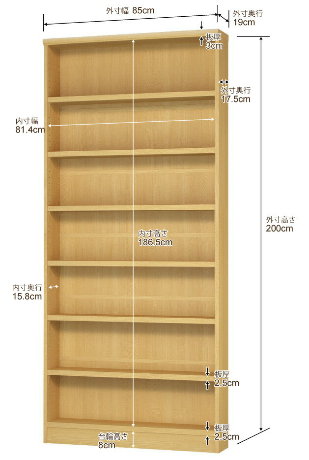 本棚 スリム 薄型 奥行19cm 高さ200cm 幅85cm 日本製 オーダー本棚 幅1cm単位 サイズオーダー 全棚可動 書棚 シェルフ フォースター対応 コミック 文庫本 オープンラック 耐荷重タイプ
