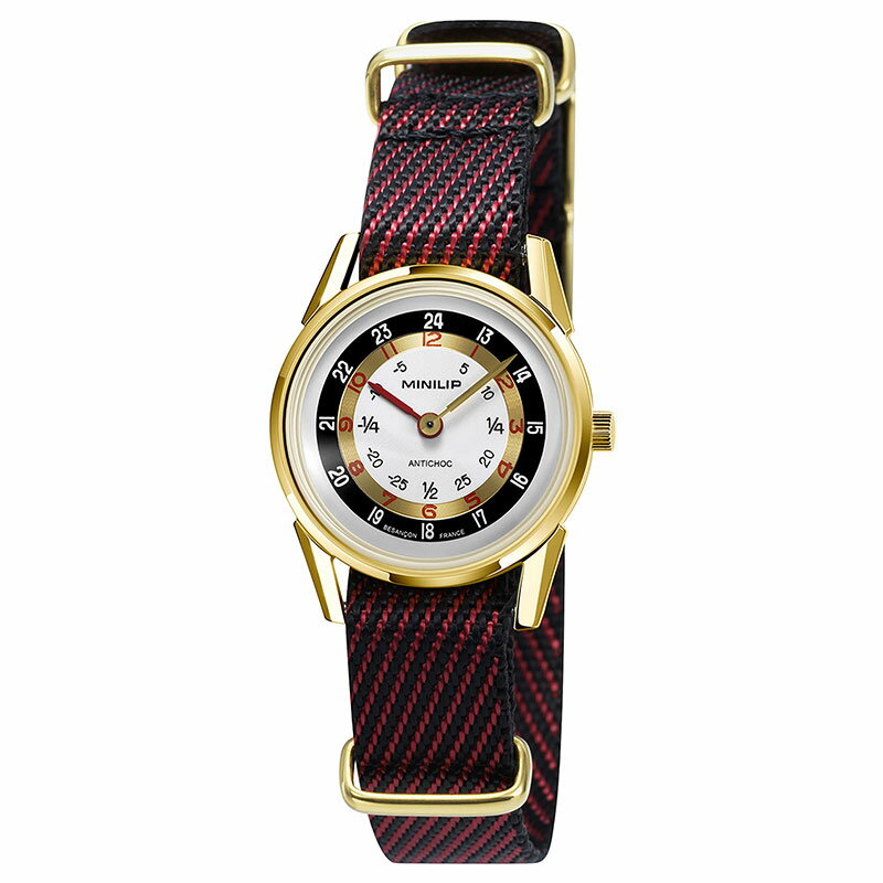 リップ[LIP]フランスらしいユニークなデザインが人気の名門時計メーカー・リップ(Lip)社。その歴史は大変古く、フランス・ベザンソンの時計技師エマニエル・リップマンが1807年に制作したストップウォッチに始まります。歴史上の人物にも時計を贈呈した経歴でも有名で、1810年にナポレオン1世がベザンソンに訪れた際、彼に時計を贈呈したという記録が残っているほどです。時計以外にも、フランス空軍機のコックピットの計器類を制作するなど、技術力でも確かなものがあり、信頼を得ていました。チャーチル首相、フランスのドゴール大統領や、アメリカのアイゼンハワー大統領など、世界のVIPも愛用するほどデザインや精度も洗練されています。1974年には”Mach 2000” (マッハ 2000)シリーズが、当時のデザイナーであるロジェ・タロン(ROGERTALLON)氏の手で生み出され、今日までリップ社の代表的モデルとして高い人気を誇っています。その後もリバイバルセブンティーズシリーズをリリースしたり、現在も若いデザイナーの斬新な発想を取り入れて次々と新作を発表しています。1969年:「子供向けの時計ではありません」-Mini Lipの誕生「大きい、広い。重くて、文字盤が3つ。これは子供向けの時計ではありません。」このユニークなスローガンとともに、1969年にMINI LIPは発売されました。当時の広告は遊び心とユーモアにあふれ、多くの注目を集めました。MiniLipは、時間を学ぶための教育用時計として特別に設計され、リップのマニュファクチュールの技術が存分に生かされています。フランス・ブサンソンで100年以上の歴史を持つリップは、1960年代末に「手ごろな価格で高品質な時計」という当時のリップの哲学を体現し、時間を読む楽しさを提供する時計を生み出しました。そして、リップはついにこのアイコニックな時計を付加kつさせます。当時のオリジナルモデルを忠実に再現した2つのバージョンが登場し、子供のころの心を忘れないすべての人に贈られる時計となります。忠実な際限のため、着け心地や機能面では手のかかる腕時計となっております。しかし仕上がりやカラーリングは時計マニアやオシャレ好きも唸る出来栄えとなっており、ファッションを楽しみたい方、手をかけて時計を育てたい方、所有欲を満たしたい方にご使用いただきたい特別な限定モデルです。遊び心を持ち続ける大人たちへ贈る、伝説の腕時計1969年に誕生した「ミニリップ」は、6〜8歳の子ども向けに設計された教育用時計でした。しかし、その斬新なデザインと独自の時間表示方式は、単なる子ども向けにとどまらず、当時の時計業界の常識を覆しました。「ミニリップ」は、今もなお時を超え、レトロなスタイルの象徴として大人たちをも魅了し続けています。そして2025年、その「ミニリップ」が大人向けのアイコニックなモデルとして新たな装いで蘇ります。ヴィンテージ感あふれる完璧なサイズ(29mm)と、直感的な時間の読み方を可能にする針のデザイン「ミニリップ」は、クラシックな29mmケースに再設計され、特徴的な3つの文字盤を備えています。分単位、午前の時間、午後の時間を明確に読み取ることができるこのデザインは、LIPブランド発祥の地・ブザンソンの卓越したクラフトマンシップと創意工夫を象徴するものです。「ミニリップ」には2本の針のみが搭載されており、赤い短針が「時間」、長い針が「分」を示します。このデザインにより、時間の読み間違いを防ぎ、直感的に時を捉えることができます。3つの文字盤が織りなす、ユニークな時間の流れ1.ブラックの数字(分単位表示ダイヤル)シンプルかつ直感的なデザインで、15分(1/4)、30分(1/2)といった表記により、時間を瞬時に把握可能。視認性の高さが特徴です。2.レッドの数字(モーニングダイヤル)朝の時間帯(0時〜12時)を表示。7時の朝食、8時の出勤、10時のコーヒーブレイク、12時のランチタイムなど、忙しい午前中をサポートします。3.ホワイトの数字(アフタヌーンダイヤル)午後の時間帯(13時〜24時)を表示。13時のコーヒータイム、17時の「第2の1日」の始まり、そして深夜24時の就寝時間まで、大人のライフスタイルに寄り添うデザインです。伝統を受け継ぎながら進化した、新生ミニリップ朝7時の慌ただしい時間も、午後5時のリラックスタイムも、ミニリップならフレンチスタイルの時間の流れとともに楽しむことができます。もはやこれは、子どもたちのための時計ではありません。子どものような純粋な心を持ち続ける、大人のためのタイムピースです。 型番lip-671970ケース材質:ステンレススティールサイズ約:径29mm重さ:約31gベルト幅:14mmベルト材質:ナイロンカラー:レッド ブラックムーブメント機能アナログ2針24時間表示1.ブラックの数字(分単位表示ダイヤル)シンプルかつ直感的なデザインで、15分(1/4)、30分(1/2)といった表記により、時間を瞬時に把握可能。視認性の高さが特徴です。2.レッドの数字(モーニングダイヤル)朝の時間帯(0時〜12時)を表示。