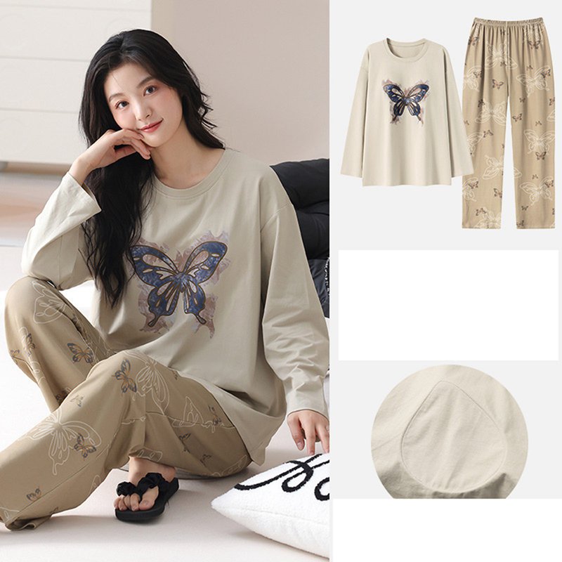 ルームウェアセット 丸首 胸パッド付き 春秋向き パジャマ レディース 長袖 ロングパンツ 上下セット コットン 綿 肌に優しい 部屋着 寝巻き 薄手 通気 吸湿 ナイトウェア お出掛け