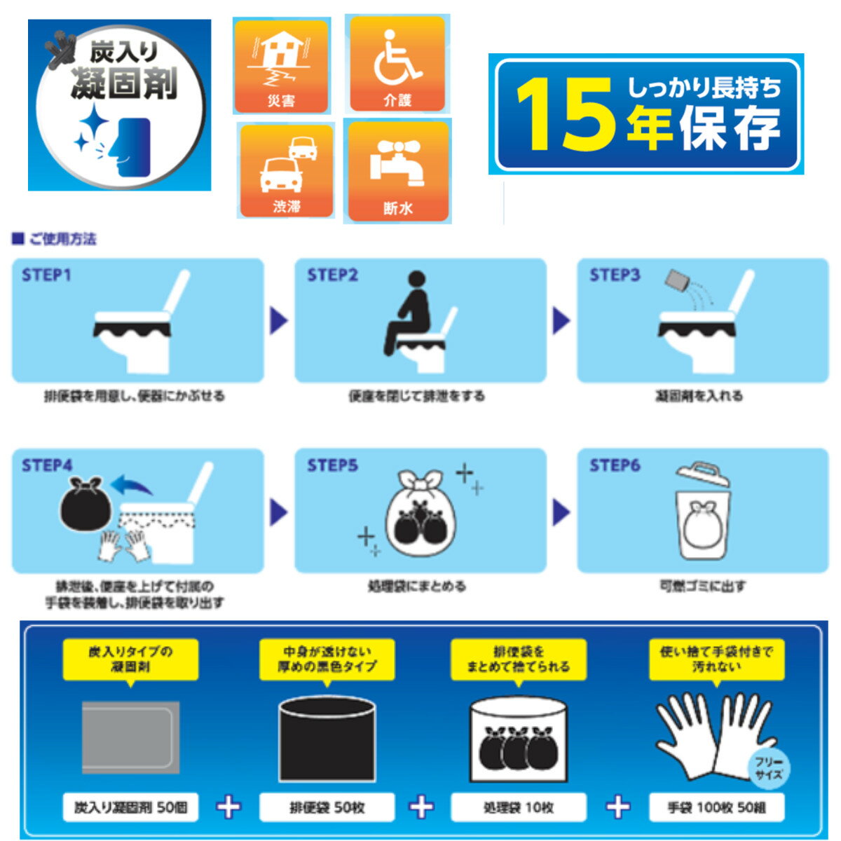 商品名 いつでもトイレセット 仕様 本体サイズ: 排便袋・処理袋:65cm×50cm 凝固剤:10g 個装サイズ/重量:約W19.4×D12.4×H21.5cm/約1.08kg 材質: 排便袋・処理袋:ポリエチレン 凝固剤:高分子ポリマー、炭 (個装:アルミ) 手袋:ポリエチレン 原産国:中国製 JAN:4944109317033 事業者:(株)富士 〒465-0024 愛知県名古屋市名東区本郷3-148 説明 もしもの時に備える、大容量50回セット