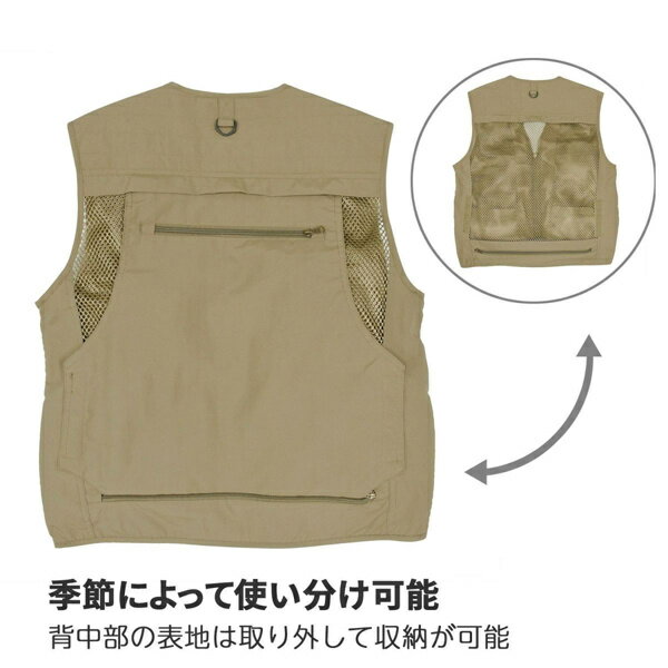 King シューティングベスト K-SV-15BG XLサイズ ベージュ 撮影に便利なシューティングベスト。 15箇所のポケットを備えており、様々なものを収納して身軽に動くことができます。 写真撮影はもちろんのこと、釣り・山登り・サバイバルゲームなどアイディア次第で様々な用途でご使用いただけます。2重構造の生地の内側には、通気性の良いメッシュ素材を使用。背中部の表地は取り外して収納が可能なので、暑い季節は通気性の良いメッシュ生地で使用できます。サイズ展開も豊富なため、ファッションに合わせてお好みの着こなしを楽しめます。