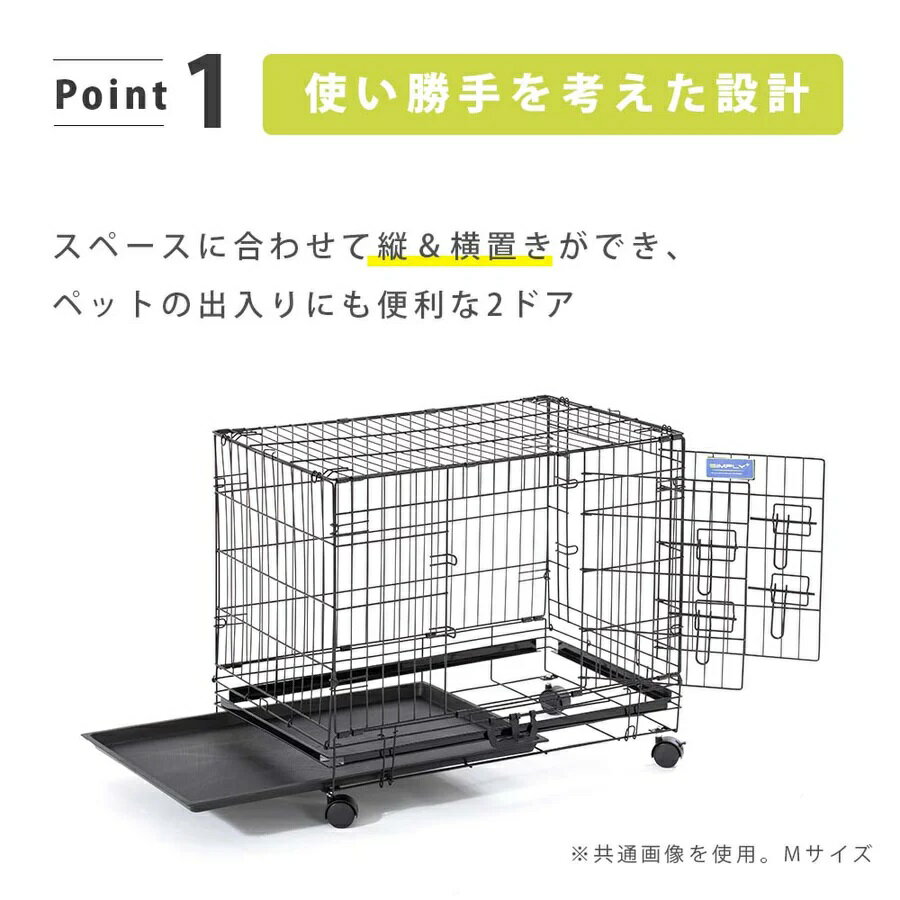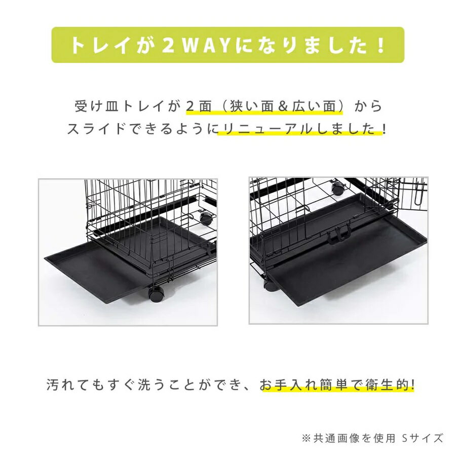 商品説明 2ドア&キャスター付きのスチール製ケージ がさらに使いやすく、リニューアルしました。 ※XXLサイズは車輪は付属品しません。 ケージの掃除で一番面倒なのが下のトレー部分ではないでしょうか。 シンプリーメゾンのケージはトレーが長面&短面どちらからも引き出せるためお掃除も簡単。 ・スペースに合わせて縦&横置きができ、ペットの出入りにも便利な2ドアです。 ・キャスター付でお出かけの時はもちろん、掃除機をかける時も楽々によけることが出来きます。 ・お部屋での使用から、コンパクトに折りたたんでドライブ・旅行にも便利なペット用ゲージです。 ・簡単に組み立て、折りたたむ事が出来るので、使わない時は省スペースで収納でき、移動するときもラクラク。 ・脱走犯に安心な屋根付きで、上にペットシートなど良く使うものを置くこともできます。 ・災害時の避難・移動用にも活躍できます。