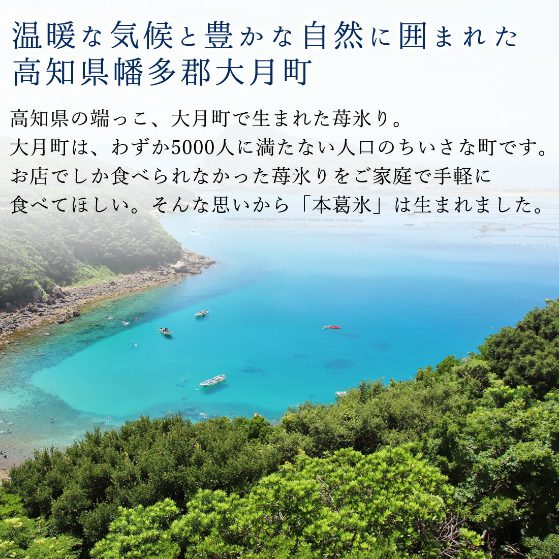 【「道-1グランプリ」受賞の味をお楽しみください】 道-1グランプリ スイーツ部門でグランプリを受賞した高知県大月町の人気のかき氷「苺氷り」。 全国のお客様にもっと手軽に食べてもらいたいとの生産者さんの想いから、からだにやさしい「吉野本葛」を加え、溶けづらいふんわり食感のかき氷「本葛氷り」が出来上がりました。 出来立てふんわり食感の本葛氷りは、冷蔵庫から出して10分くらい常温でおいてからお召し上がりください。 道-1グランプリで受賞した「苺氷り」をそのまま再現した「苺みるく」味のほか、みかん、ラ・フランス、レモン、焼きいも、チョコレートからお選びいただけます。全ての味を一度に楽しめる「おためし6個セット」もございます。