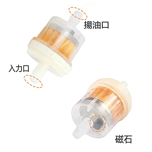 商品情報商品の説明主な仕様 1.高品質の燃料フィルタは、モータが故障しているか、または損傷しているのを防ぐことです。車をより安全で信頼性の高いものにする。定期的な交換をお勧めします。br2.ペーパーろ過タイプフィルター、濾過能力に優れたタイプです。スケルトンボディで不純物の確認及びフィルター寿命をひと目で確認出来ます。br3.グネットイン構造になっているため、錆びや鉄くずもキャッチします。br4.汎用タイプガソリンフィルター8個セット。サイズ:長い50mm*幅30mm。ホース内径 5mm 〜 6mm に対応。br5.燃料フィルターは磁石付きです、錆や鉄くずを捕獲できます。バイク、自動車、航空、建設機械など多くに使われます。※ご注意:ガソリンの流量が必要なバイクへは不向きです。