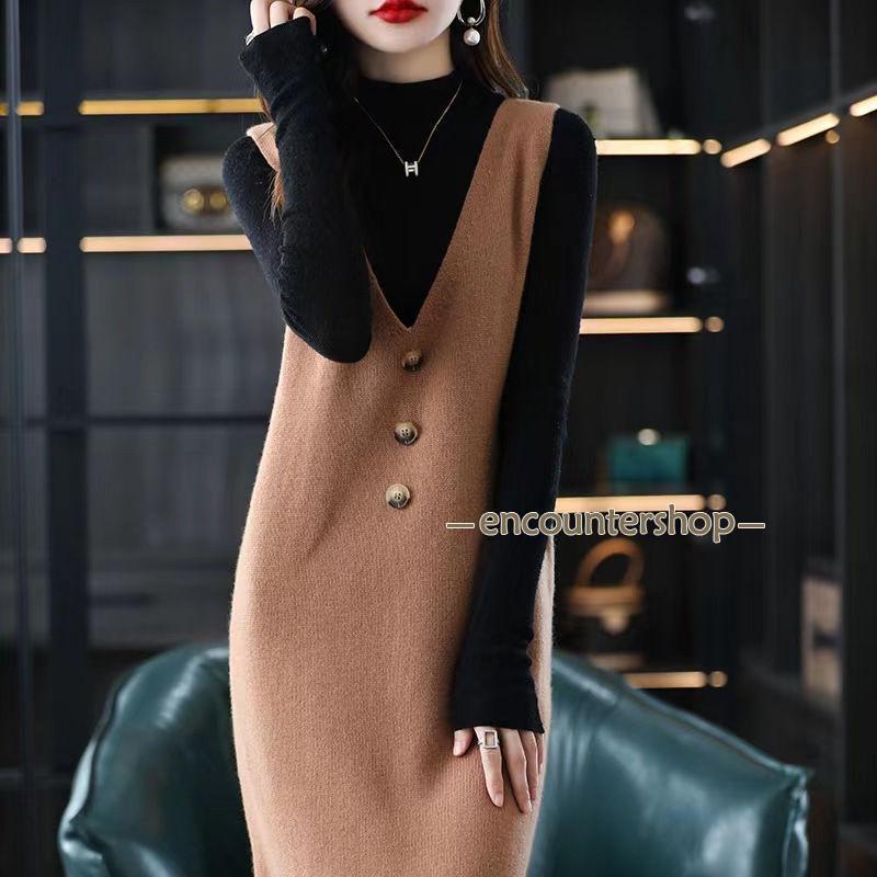ニットベスト レディース ベストワンピース ロング トップス プルオーバー ゆったり レイヤード vネック ノースリーブ 体型カバー 重ね着 上品