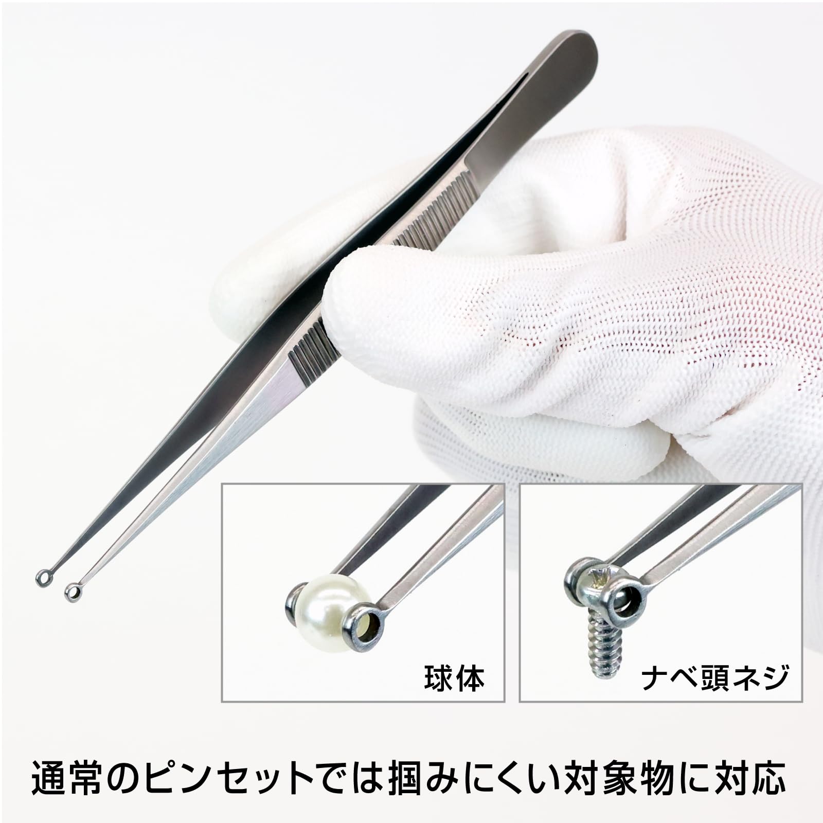 【用途】球体のピックアップ、ネジ掴み、部品交換・組立作業、自転車ハブメンテナンス、ハブグリスアップ、プラモデル・模型・アクセサリーの製作、UVレジン、ネイルアート、まつエク、ビーズワーク、アイロンビーズ、手芸、ドールハウス主な仕様 異形物の保持に便利なリング型ピンセット。平らなピンセットに比べ丸型や角型の物でも滑ることなくしっかりつかめます。サビにくいステンレス製(SUS304)。さらに、環境にも配慮したRoHS対応。br自転車のハブベアリングのボールを確実にピックアップ。brまつ毛エクステ用ツイーザー。先端が丸みを帯びているので、テープアウトの際、お肌を傷付ける心配がありません。brデコレーション用ツイーザー。先端がリング型なので、丸や角形のストーンでも滑ることなくしっかりキャッチできます。br