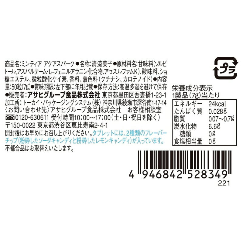 【商品説明】アサヒグループ食品 ミンティア アクアスパーク 7g(50粒入) すっきりクリアなサイダーの美味しさと、 清涼感のある味わい。 ソーダーフレーバーチップと レモンフレーバーチップを配合した 爽やかなタブレット。