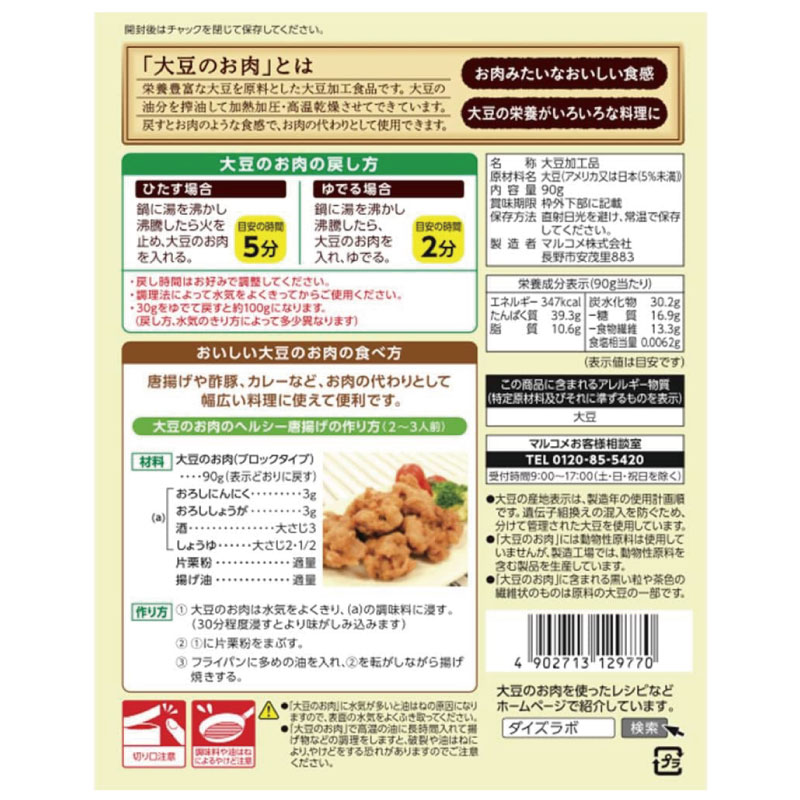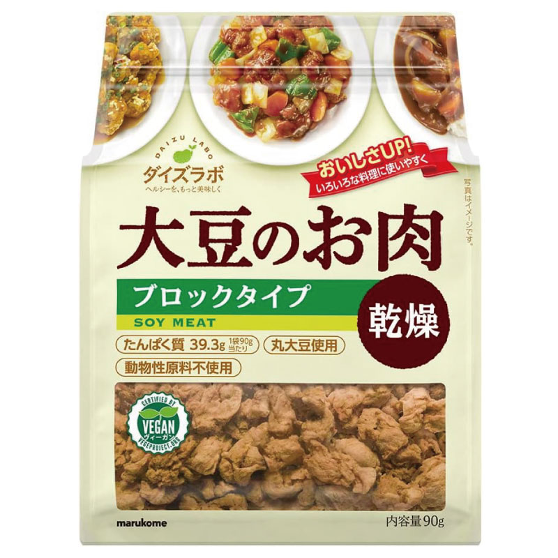 【商品説明】 マルコメ ダイズラボ 大豆のお肉 乾燥ブロック 90g 栄養豊富な大豆を原料とし、 加圧加熱・高温乾燥して作っています。 丸大豆を使用してさらにおいしくなりました。 お肉の代わりとしてから揚げ・酢豚・カレーなど、 様々な料理に使用できます。