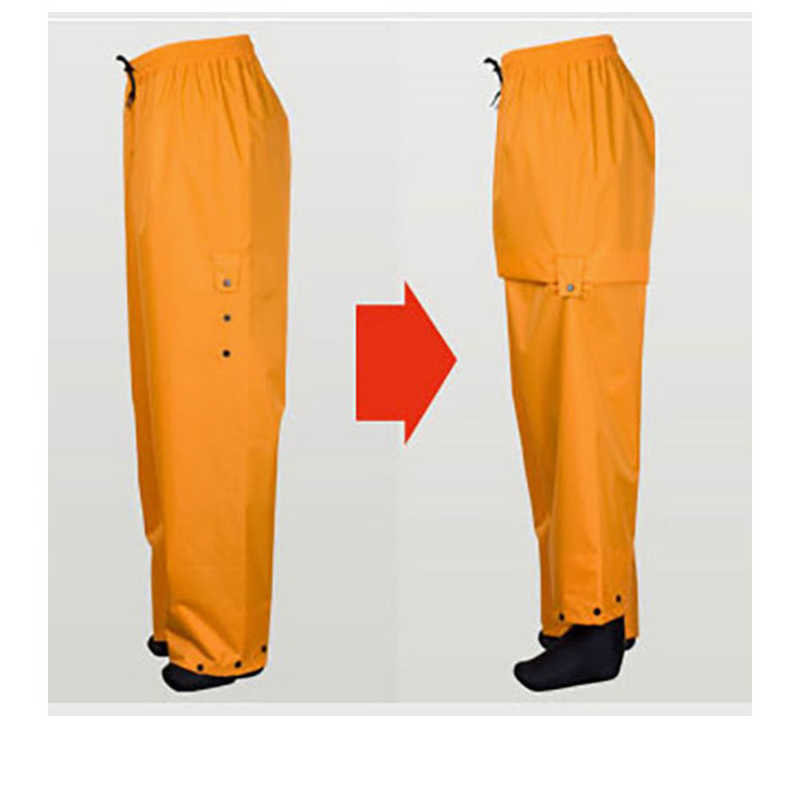 ●パンツの裾幅の調節ボタンにより雨水の跳ね上がりによる浸水を防ぐ。