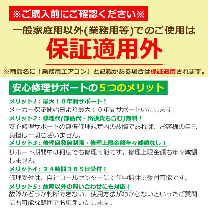 ◆延長保証のみの購入は不可となります。 ※保証対象外項目 電池、フィルター、網などの交換が容易な消耗品交換 製品使用に影響のない損害(日焼け、変色など) 故意、過失による製品の故障 天災(火災、落雷、地震など)や人災(盗難・落下・ウイルス)が原因での故障 一般家庭用以外(業務用)での使用で生じた故障(業務用エアコンは対象)