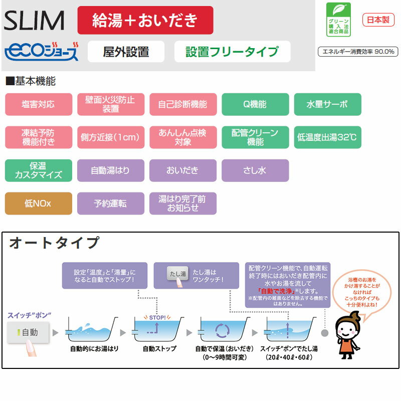 【商品説明】 シャワーや台所水栓などのお湯はエコジョーズ 浴槽のお湯張りや追い炊きもエコジョーズ 毎日使うお湯をエコジョーズで節約。毎日をエコライフに。 スリムタイプなので狭所でも設置可能 ※こちらの商品は受注生産品となります。 納品までの期間はメーカーの状況によって変動する可能性がございます。 納期の詳細が判明次第、当店より改めてご連絡させていただきます。 ご注文の際は、あらかじめご了承くださいますようお願いいたします。