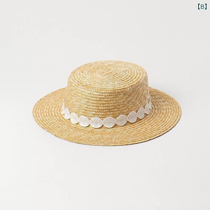 麦わら帽子 レディース かわいい 麦わら 帽子 フランスの 休日の ビーチハット サンハット レース 飾り つばの 広い フラット ハット アウトドア 旅行用