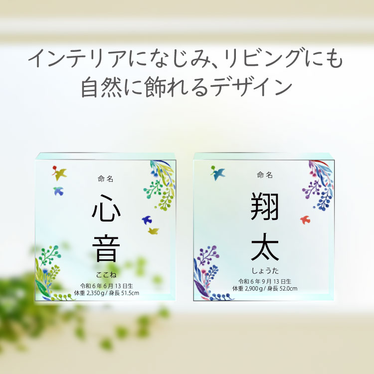 【注意事項】 ・アクリル素材の色の厚さ分多少青みがかった仕上がりとなります。 ・モニター発色の具合により色合いが異なって見える場合がございます。 ・商品の改良により、仕様・外観・イメージ・カラーは予告なく変更になる場合がございます。予めご了承ください。 特別な思い出をカタチに、生まれた瞬間を美しく刻む命名書 命名式や節句、内祝いなどの特別な場面での利用におすすめです。赤ちゃんの名前や生年月日、身長、体重などの情報を美しく刻むことで、特別な思い出を形にすることができます。初孫や親戚の赤ちゃんの誕生記念、成長記録としても最適です。 ◎ 主な特徴 ・シンプルでかわいらしいデザイン お花や動物など10種類のデザインから選べます。 インテリアに自然に溶け込むデザイン 透明感あふれるガラス命名書は、リビングになじみ自然に飾れます。 ◎ こんな方におすすめ ・ご両親やご親戚へ … 初孫や親戚の赤ちゃんの誕生記念に。 ・ご友人へ … 出産祝いの特別なギフトとして。 ・ご自身のお子さんに … 成長の記念として大切に残せるアイテム。 ・職場の同僚へ … 出産のお祝いとして気持ちを込めて。 ・出産祝いやベビーギフトを探している方にも最適 どんな方にも喜ばれる、思い出に残る一枚になります! 命名書は、赤ちゃんの「名前」と「生まれた日」を大切に残すものです。名前に込めた想いや願いを形にし、成長を見守る記念としてお届けします。