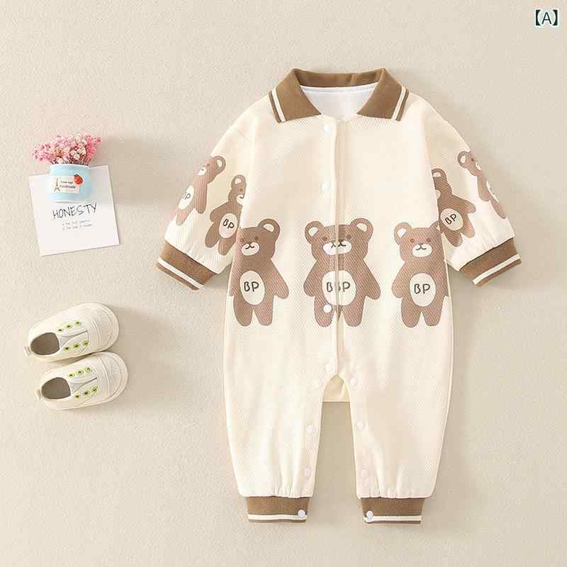 ロンパース 男の子 ベビー 新生児 カバーオール オールインワン 襟付き くま柄 二重生地 お出かけ着 春秋 長袖 綿100% 肌に優しい 前開き ベージュ 韓国デザイン