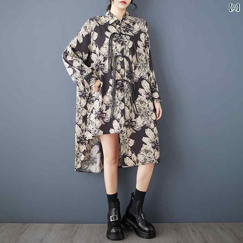 シャツワンピース レディース 女性用 春秋 ルーズフィット ゆったり アシンメトリー 切り替えデザイン プリント柄 チャイナボタン ミドル丈 長袖 襟付き おしゃれ カジュアル ポリエステル シングルブレスト