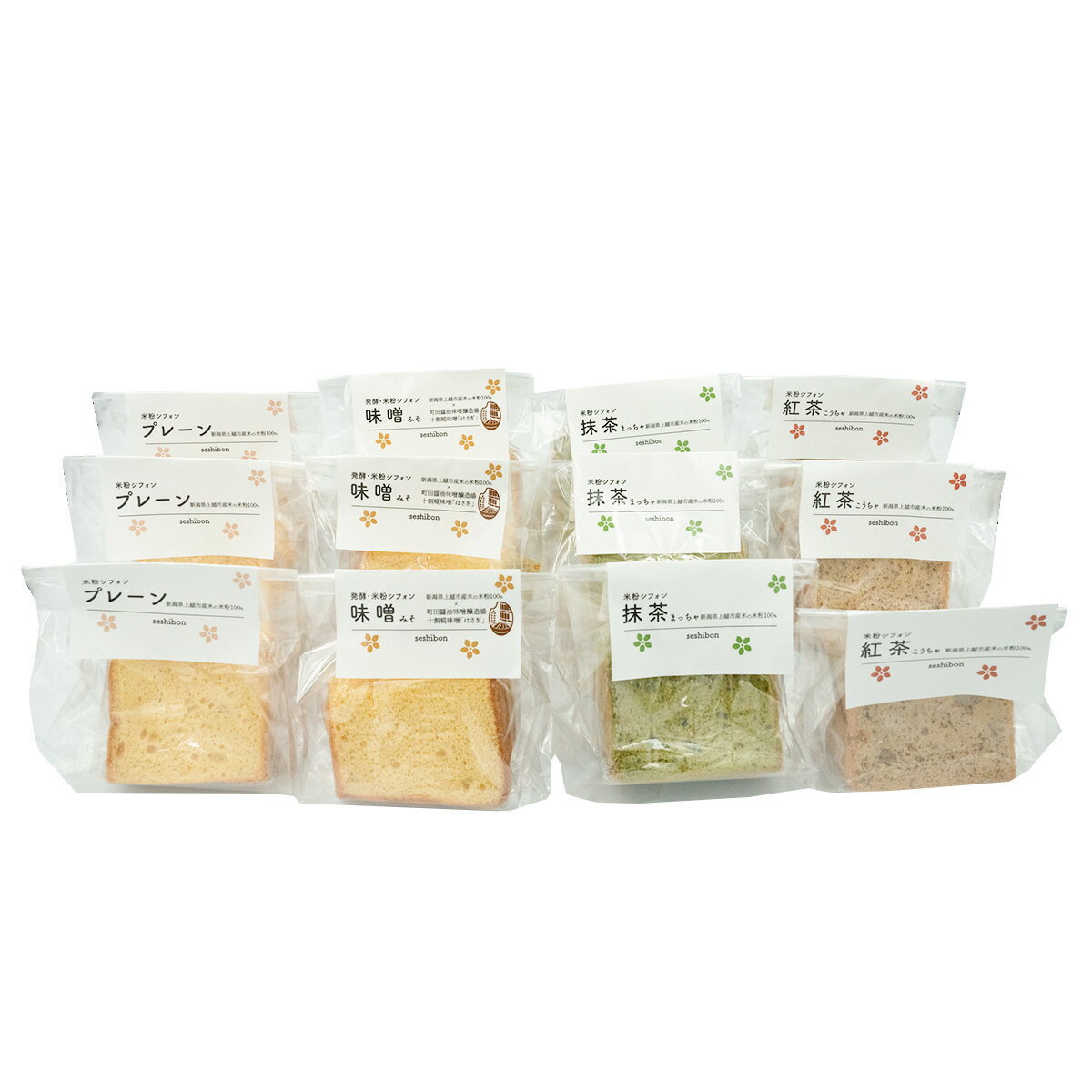 [新潟県上越市産米の米粉100%]オリジナルシフォンケーキ みそセット(みそ×3 プレーン×3 紅茶×3 抹茶×3)12個入[雪詩慕雲上越店]