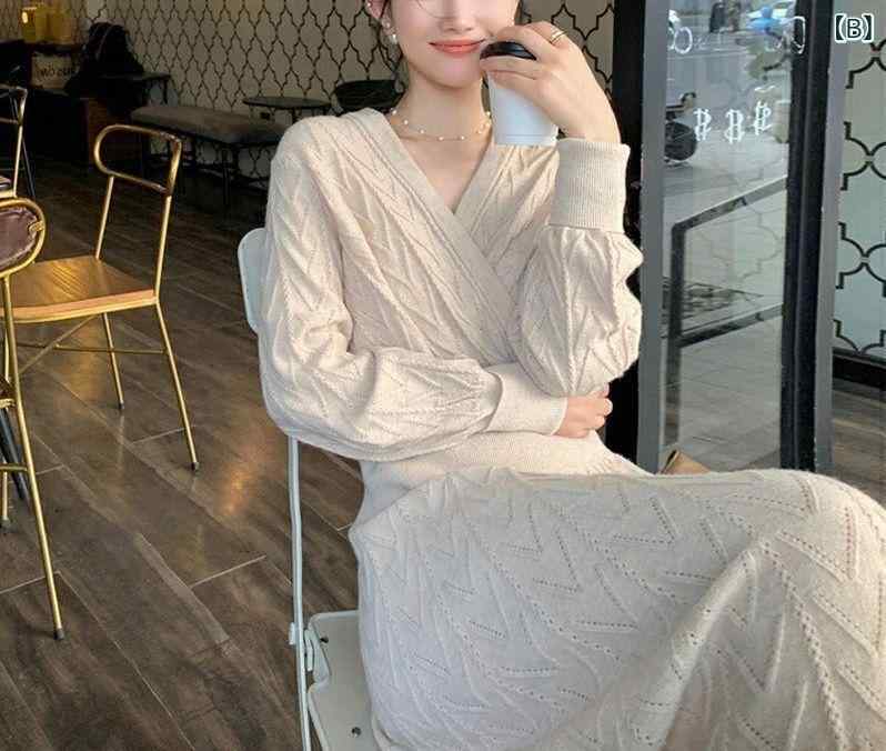 ワンピース レディース 秋冬 高見え 黒 Vネック ニットワンピース 高腰 スタイルアップ ミモレ丈 ロングワンピース コットン 長袖 スリム タイトワンピース お洒落 レトロ