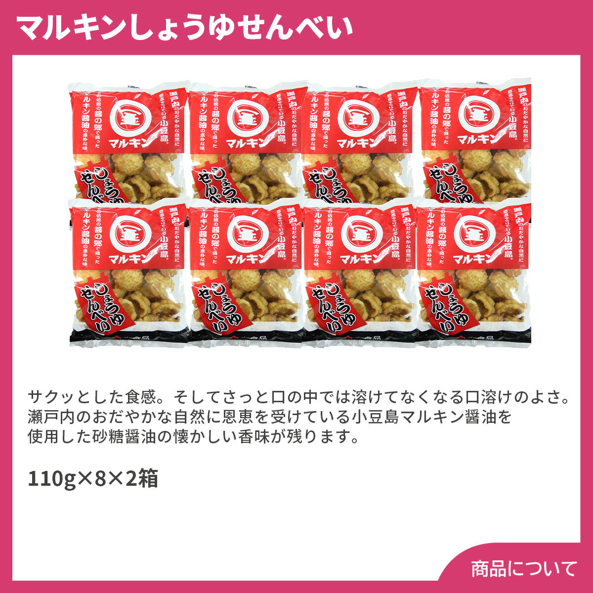 商品詳細 -Spec- 商品名 香川 小豆島限定!マルキンしょうゆせんべい 内容量 110g×8×2箱 アレルゲン特定 小麦 加工地 福岡 出荷地 香川 保存方法 常温 賞味期間 製造日より120日 コメント サクッとした食感。そしてさっと口の中では溶けてなくなる口溶けのよさ。瀬戸内のおだやかな自然に恩恵を受けている小豆島マルキン醤油を使用した砂糖醤油の懐かしい香味が残ります。