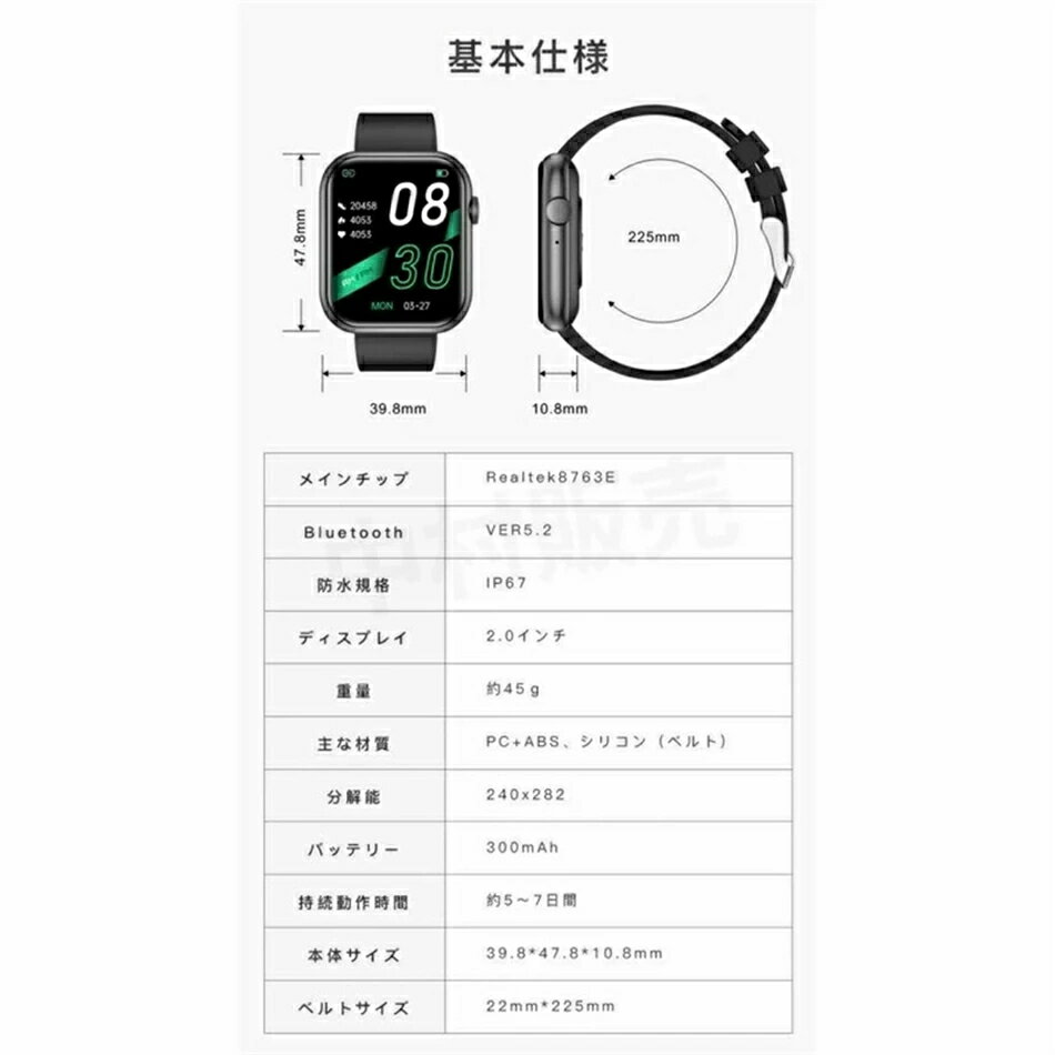 【健康管理】 体温、心拍数、血圧が測定でき、アプリで同期した後自分の健康状態データが一目で分かる ※注意:専門の医療器材ではありませんので、心拍数、体温、血圧計測値などをご参考にしてください。 パッケージ 本体*1 バンド*1 充電ケーブル*1 取説*1(日本語) 対応機種 IOS9.0以上、Android4.4以上 iPhone各種: iPhone14/iPhone14 pro/iPhone14 pro max / iPhone13 mini / iPhone13 / iPhone13Pro / iPhone13ProMax / iPhone12 / iPhone12mini / iPhone12Pro / iPhone12ProMax / iPhone11 / iPhone11Pro / iPhone11ProMax / iPhoneXS / iPhoneXSMax / iPhoneXR / iPhoneX / iPhone8 / iPhone8Plus / iPhone7 / iPhone7Plus / iPhone6 / iPhone6s / iPhone6Plus / iPhone6sPlus / iPhoneSE / iPhone5s / iPhone5 / iPhone5c..etc Android各種: Samsung: Galaxy S10/S10 Plus、Galaxy S9/S9 Plus、Galaxy S8/S8 Plus、Galaxy note 5/note 8、Galaxy S6/S6Edge/S6 Edge Plus/ S7/S7 Edge Sony: Xperia XZ3、Xperia XZ2、Xperia XZ1、Xperia XZs、Xperia XZ、Xperia Z5、 Xperia Z4、 Xperia Z3 AQUOS: AQUOS R3、AQUOS R2、AQUOS R、AQUOS sense 2、AQUOS sense Plus、AQUOS R compact HUAWEI: HUAWEI P40 Pro、HUAWEI P40 lite 5G、HUAWEI P40 lite E、HUAWEI P30 Pro、HUAWEI P30 lite、HUAWEI P20、HUAWEI P20 Pro、HUAWEI P20 lite、HUAWEI Mate10 Pro、HUAWEI Mate10 lite、HUAWEI P10、HUAWEI P10 lite、HUAWEI P10 Plus、HUAWEI nova、HUAWEI nova2、HUAWEI nova3、HUAWEI nova lite、HUAWEI nova lite2、HUAWEI nova lite3、HUAWEI mate 9、HUAWEI honor 9arrows、ASUS、Zenfone、HTC、LG、Google、Nexus、Microsoft ...etc 関連キーワード iphone/android 対応 母の日 父の日 バレンタイン プレゼント 腕時計 恋人 友達 キッ ズ 子供 父 母 プレゼント スマートウォッチ LINE 活動量計 心拍計 血圧計 歩数計 IP67防水 USB式 腕時計 レディース メンズ スマートブレスレット 日本製ではありません 着信通知 睡眠検測 アラーム 時計 腕 誕生日 ランニングウォッチ 消費カロリー スト GPS運動 日本語説明書 子供 バレンタイン 母の日 プレゼ 母の日ギフト 誕生日 父の日ギフト 父の日 プレゼント 母の日ギフト 母の日 プレゼント 実用的 母の日ギフト 花以外 母の日 花以外 敬老の日 記念品 クリスマスプレゼント バレンタインギフト ホワイトデーギフト 内祝 内祝い お祝い返し ウェディングギフト ブライダルギフト 引き出物 引出物 結婚引き出物 結婚引出物 結婚内祝い 出産内祝い 命名内祝い 入園内祝い 入学内祝い 卒園内祝い 卒業内祝い 就職内祝い 新築内祝い 引越し内祝い 快気内祝い 開店内祝い 二次会 披露宴 お祝い 御祝 結婚式 結婚祝い 出産祝い 初節句 七五三 入園祝い 入学祝い 卒園祝い 卒業祝い 成人式 就職祝い 昇進祝い 新築祝い 上棟祝い 引っ越し祝い 引越し祝い 開店祝い 退職祝い 快気祝い 全快祝い 初老祝い 還暦祝い 古稀祝い 喜寿祝い 傘寿祝い 米寿祝い 卒寿祝い 白寿祝い 長寿祝い 金婚式 銀婚式 ダイヤモンド婚式 結婚記念日 ギフト ギフトセット セット 詰め合わせ 贈答品 お返し お礼 御礼 ごあいさつ ご挨拶 御挨拶 プレゼント お見舞い お見舞御礼 お餞別 引越し 引越しご挨拶 記念日 卒業記念品 定年退職記念品 ゴルフ 品質保証 ※専門の医療器材ではありませんので、計測数値はあくまで参考値でございます。 ※ご注意:完全防水ではない為、潜水、または温泉など湯気溢れる場合に避けてください。 ※商品画像は、素材や照明の具合や、お客様ご使用のパソコン、モニター等の環境により、実際とは色合いが異なる場合がございますが、予めご了承下さい。 ※測る位置によって、多少の誤差が生じる場合がございます。ご了承下さい。 ※ベンゼンやシンナーなどの化学薬品に触れないでください。 ※強い磁場に近づかないでください。 ※直射日光・暖房器具 などの熱が直接あたる場所や、高温多湿の場所での使用は避けてください。 ※販売している商品は全て新品未使用です、倉庫から出荷前に検品必要ですので、箱を開封する場合もございます、予めご了承くださいませ。 ※初期不良の場合は到着後7営業日以内にご連絡ください。 ※