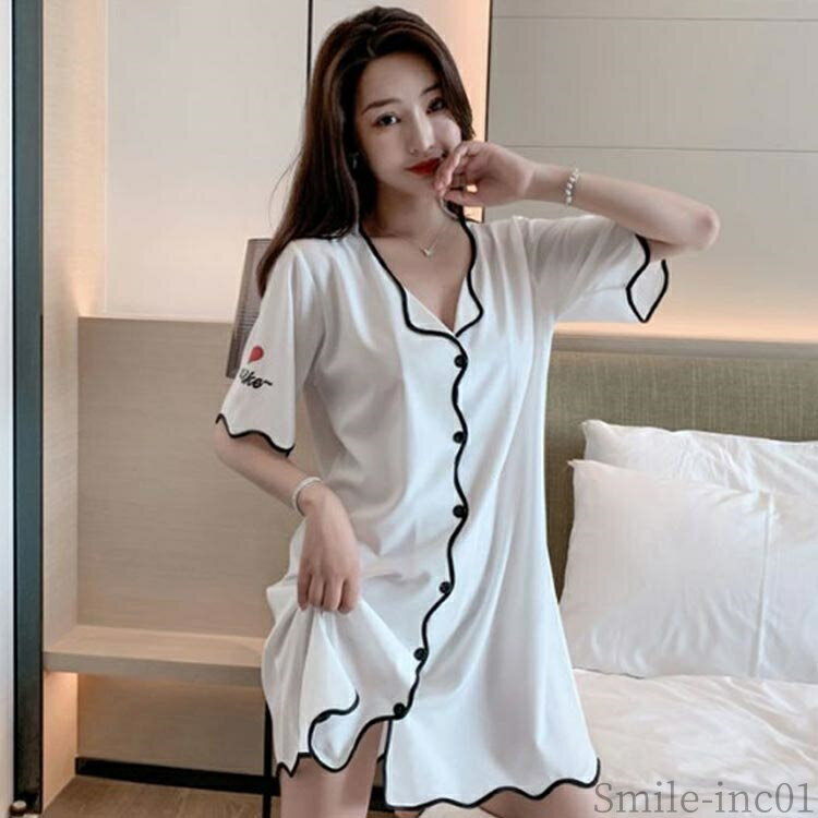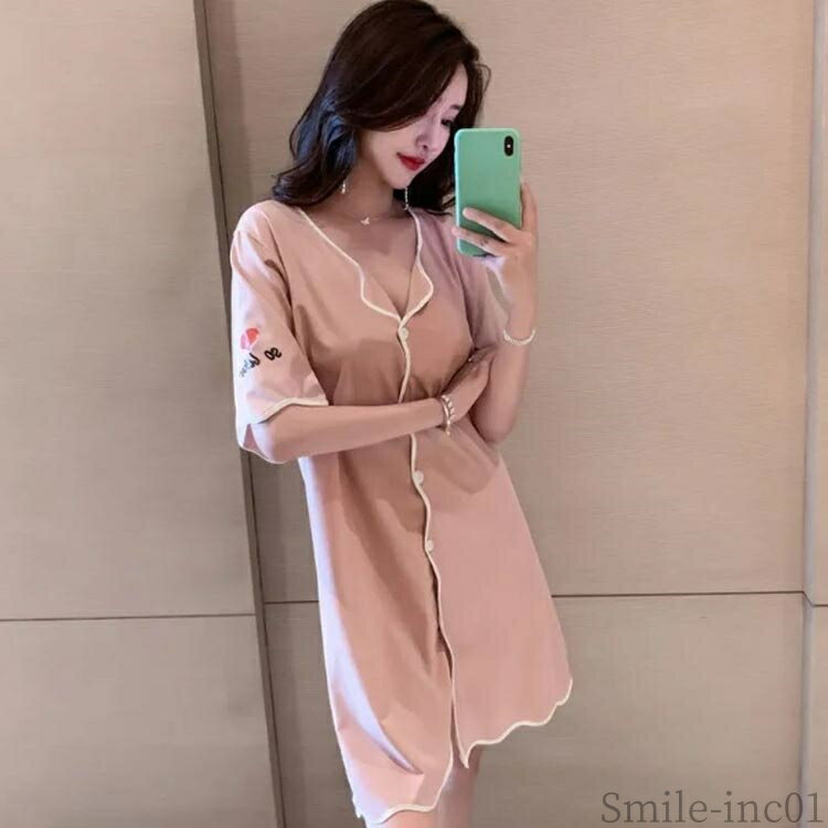 【送料無料】部 ランジェリー 寝巻き パジャマ 可愛い 無地 夏 薄手 前開き ゆったり ルームワンピース パジャマ 半袖 ワンピース レディース