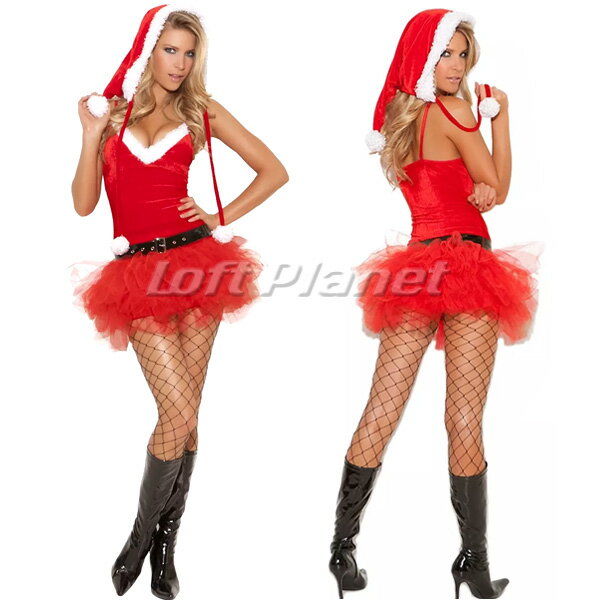 ミニのサンタ衣装。セクシー&キュートなパーティ・ドレス。ショルダーベルトの調節OK。ストレッチのベロア生地にパニエ風のレイヤースカート。この他フードハットとベルト付き。クリスマスのレディース・コスチューム3点セットです。