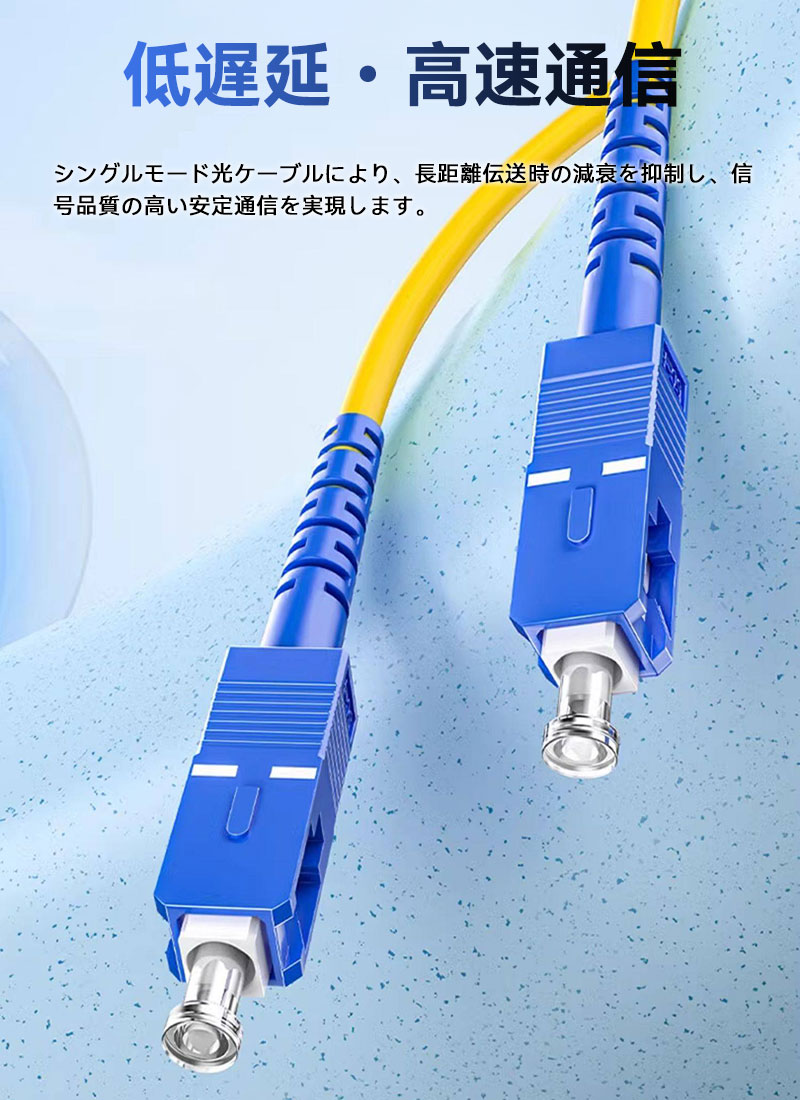 【商品仕様】 製品名 シングルモード 光ファイバーケーブル SC/LC対応|単芯・2芯(デュプレックス)選択可 三環系セラミックフェルール 1m/2m 商品概要 本製品は、シングルモード光ファイバー芯材を採用した高性能光ファイバーパッチケーブルです。 SCコネクタ・LCコネクタに対応し、単芯/2芯(デュプレックス)の2タイプから選択可能。 低挿入損失・高リターンロス設計により、安定した高速データ通信を実現します。 高精度研磨された三環セラミックフェルールを採用し、接続の安定性・耐久性・互換性に優れ、長期間安心してご使用いただけます。 商品仕様 商品名:シングルモード 光ファイバー ケーブル タイプ:単芯/2芯(デュプレックス) コネクタ:SC/LC 長さ:1m/2m フェルール:三環系セラミックフェルール ジャケット素材:PVC 挿入損失:0.3dB以下 リターンロス:50dB以上 保存温度:-20℃ ~ +70℃ 商品特長