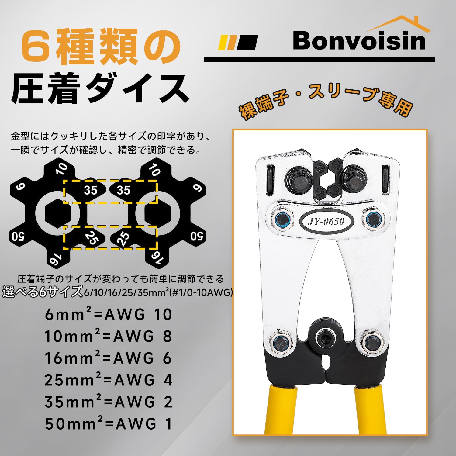 【まとめ買いで最大1000円OFFクーポン!】【送料無料】手動圧着工具 圧着ペンチ 裸圧着端子・スリーブ専用 6/10/16/25/35/50mm2対応(6-50sq対応)