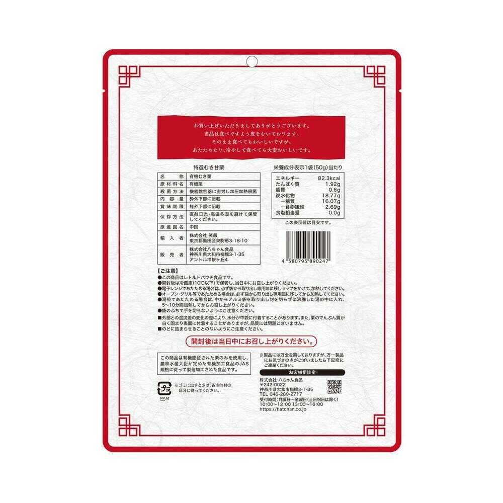 商品説明(製品の特徴)河北省産、特選有機栽培A等級ホール栗を使用してます。新鮮な栗を丁寧に皮をむき、おいしく仕上げました。保管及び取扱上の注意直射日光・高温・多湿を避けて保存してください。開封後は当日中にお召し上がりください。問い合わせ先株式会社八ちゃん食品お客様相談室電話番号:046-289-2717メーカー名(製造販売会社)株式会社八ちゃん食品原産国中国広告文責株式会社サンドラッグ/電話番号:0120-009-368JAN4580795890247x10 ※パッケージ・デザイン・内容等は、リニューアルにより予告なしに変更される場合がありますので、予めご了承ください。※お届け地域によっては、表記されている日数よりもお届けにお時間を頂く場合がございます。甘栗 栗 菓子 お菓子 おやつ