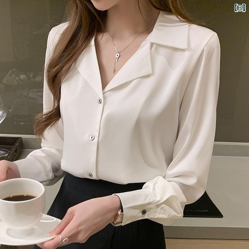 シャツ レディース 春夏 サテン トップス スーツ襟 OL風 絹 デザイン レトロ ブラック ホワイト 長袖 上品 通勤