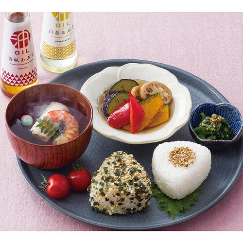 ■香味あぶら90g・白金あぶら90g各1本・和風だしの素(4g×3袋)・胡麻和えの素(5g×2袋)・かつお味胡麻(4g×2袋)・有明海苔ふりかけ(5g×2袋)各1個
