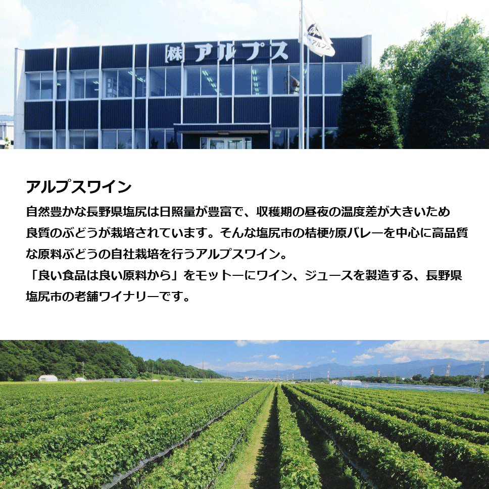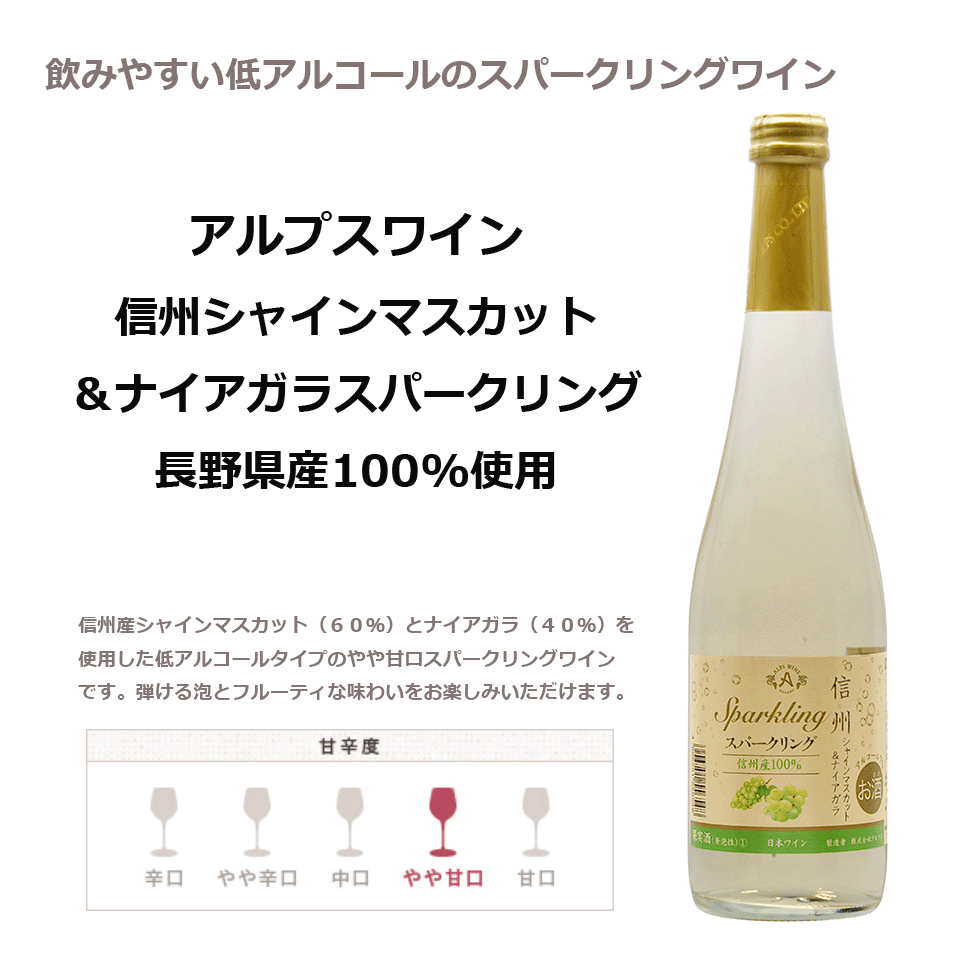 信州産シャインマスカット(60%)とナイアガラ(40%)を使用した低アルコールタイプの やや甘口スパークリングワイン 名 称 信州シャインマスカット&ナイアガラスパークリング 6本セット 酒 別 スパークリングワイン 品 種 シャインマスカット60%、ナイアガラ40% 度 数 7度 内容量 500ml×6本セット 生産者 株式会社アルプス 長野県塩尻市 保 管 常温冷暗所 業務用まとめ買いに 包装:こちらの商品は包装不可商品です。 ※沖縄への発送はできません ※画像のラベルデザインや年号(ビンテージ)は、商品と異なる場合がございます信州産シャインマスカット&ナイアガラ 長野県桔梗ケ原バレーの老舗ワイナリー「アルプスワイン」