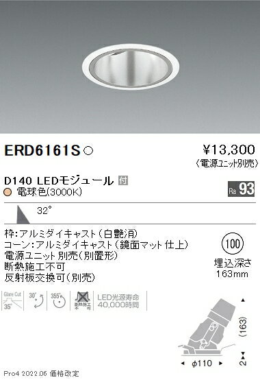 ERD6161Sテクニカルライト LEDZ DUAL-S ユニバーサルダウンライト 深型 埋込穴φ100本体のみ 電源ユニット別売 D140 広角配光32° セラメタプレミアS35W相当 電球色 遠藤照明 施設照明