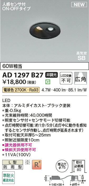 AD1297B27準耐火構造対応 人感センサ付LEDダウンライト ON-OFFタイプ 埋込穴φ75 高気密SB形ベースタイプ 広角 白熱球60W相当 電球色 非調光コイズミ照明 照明器具 防雨型